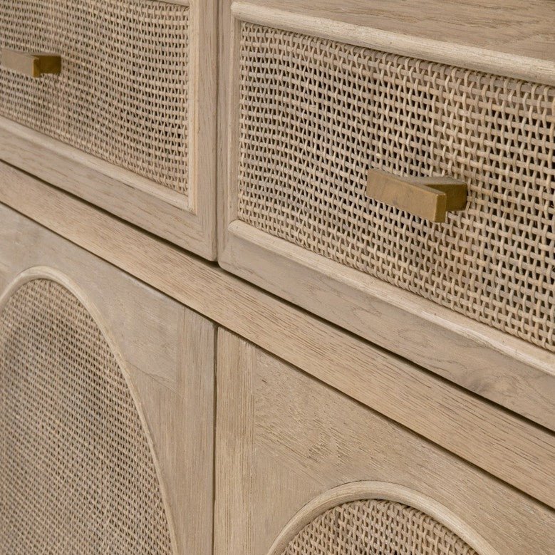 This unique smoke gray solid oak cabinet, featuring a gorgeous front cane inlay with arched wood borders, two storage drawers, and a spacious lower cabinet, offers beauty and functional storage while adding a modern farmhouse feel to any space.