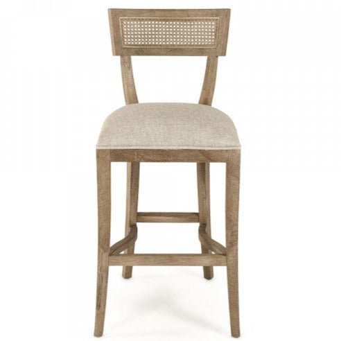 The Carvell Cane Back Bar Stool is crafted to perfection, this timeless piece boasts a modern farmhouse style, featuring a cane back and neutral upholstered seat, and is sure to complement any kitchen or bar area with modern charm.