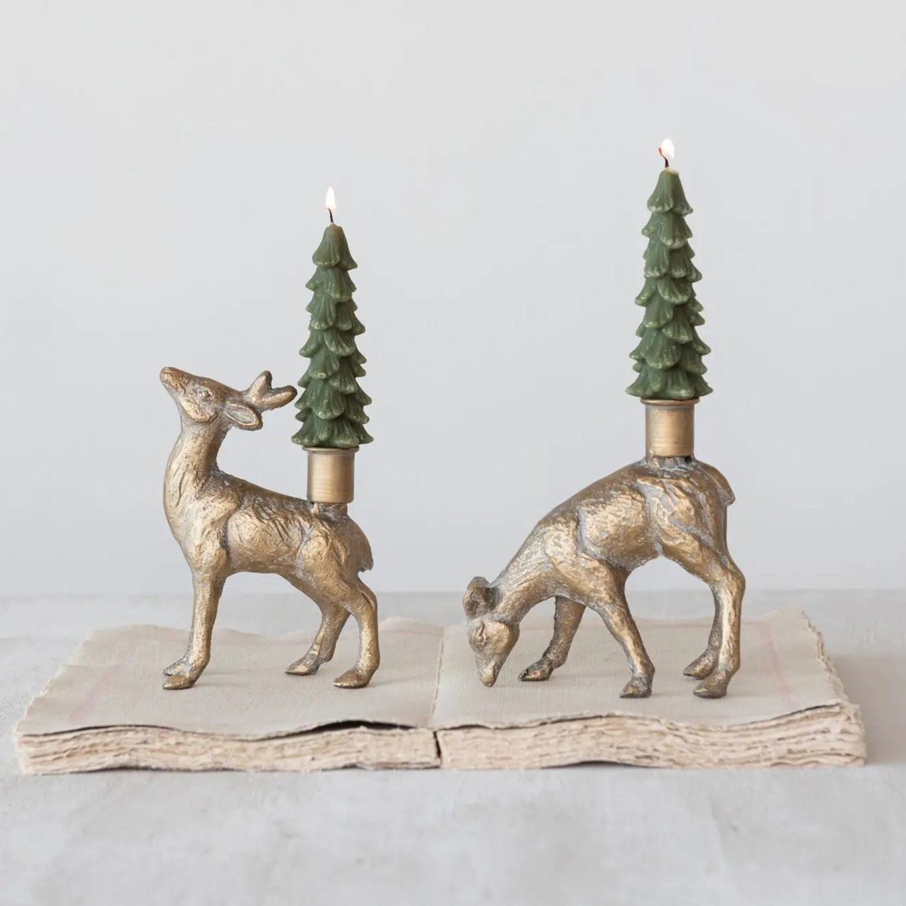 This charming set of cast iron deer taper holders brings a touch of rustic elegance to your holiday decor, finished in a whitewashed gold that feels both vintage and warm, these sweet deer look right at home in a cozy cottage holiday setting.