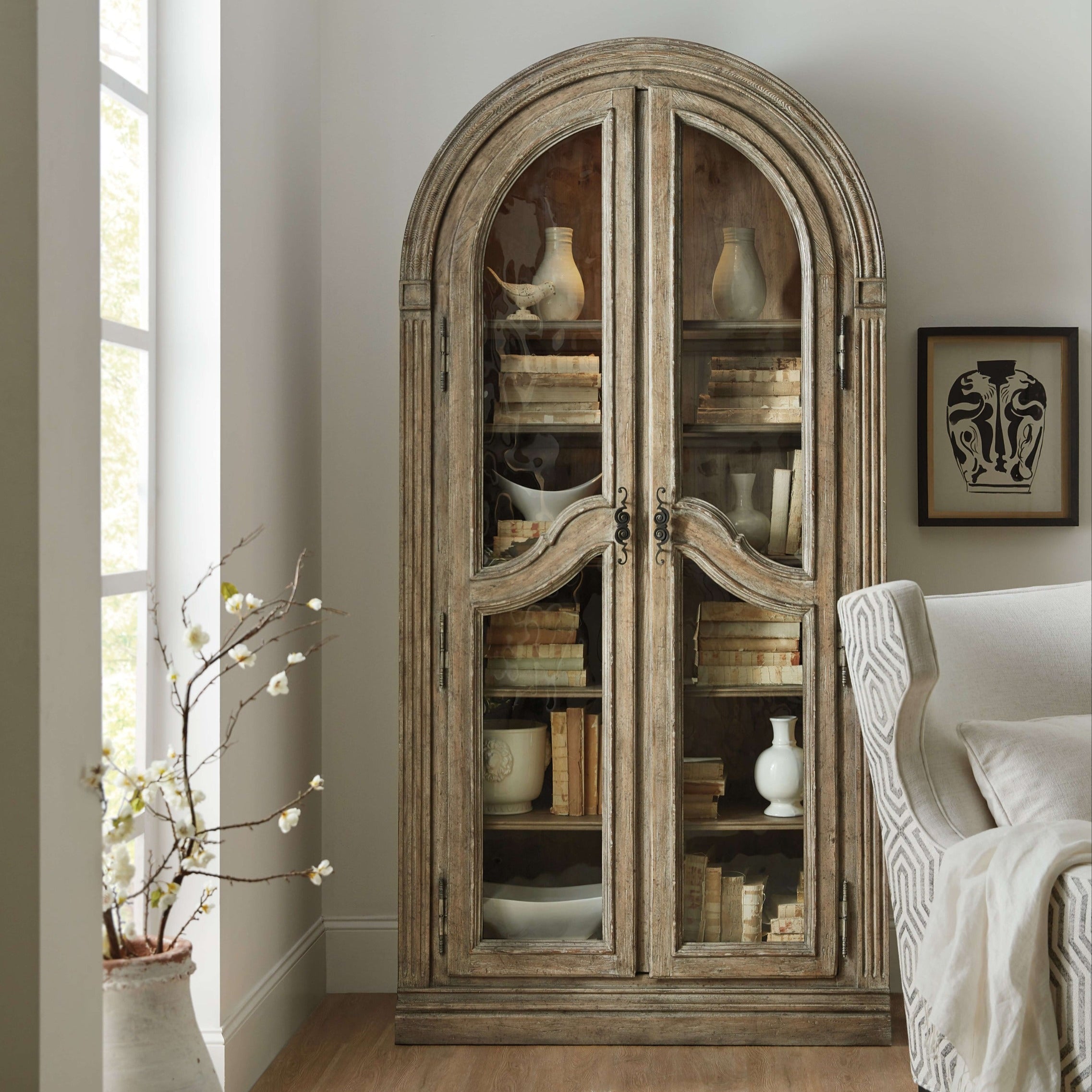In a storybook, romantic style, the laid-back luxury of of the Castella curio cabinet features a beautiful patina with two seeded glass doors and multiple adjustable shelving options, making it a beautiful and versatile statement piece for any space. Use this lovely curio alone, or bunched in twos or threes.