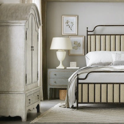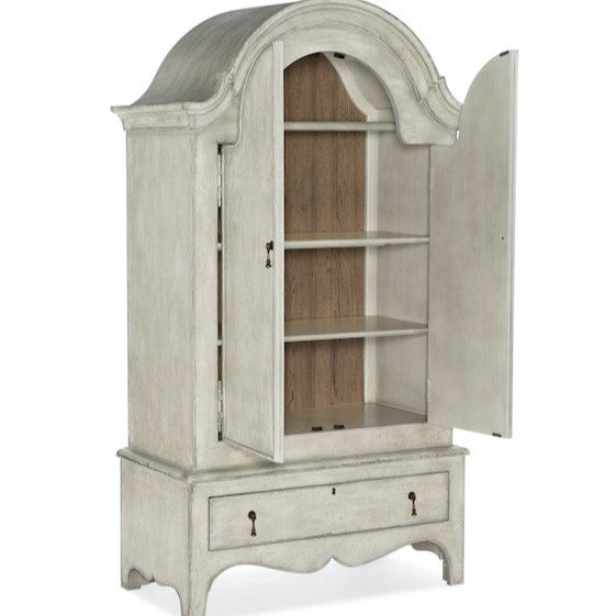 From the tip of its arched top to its delicately scalloped base, the Cia Bella Wardrobe is all romance, featuring a dreamy creamy finish that is hand chiseled to look beautifully aged, this wardrobe is packed with storage with two doors, two adjustable shelves, a clothing rod and one lower drawer, making this armoire a casual yet elegant focal point in any space.