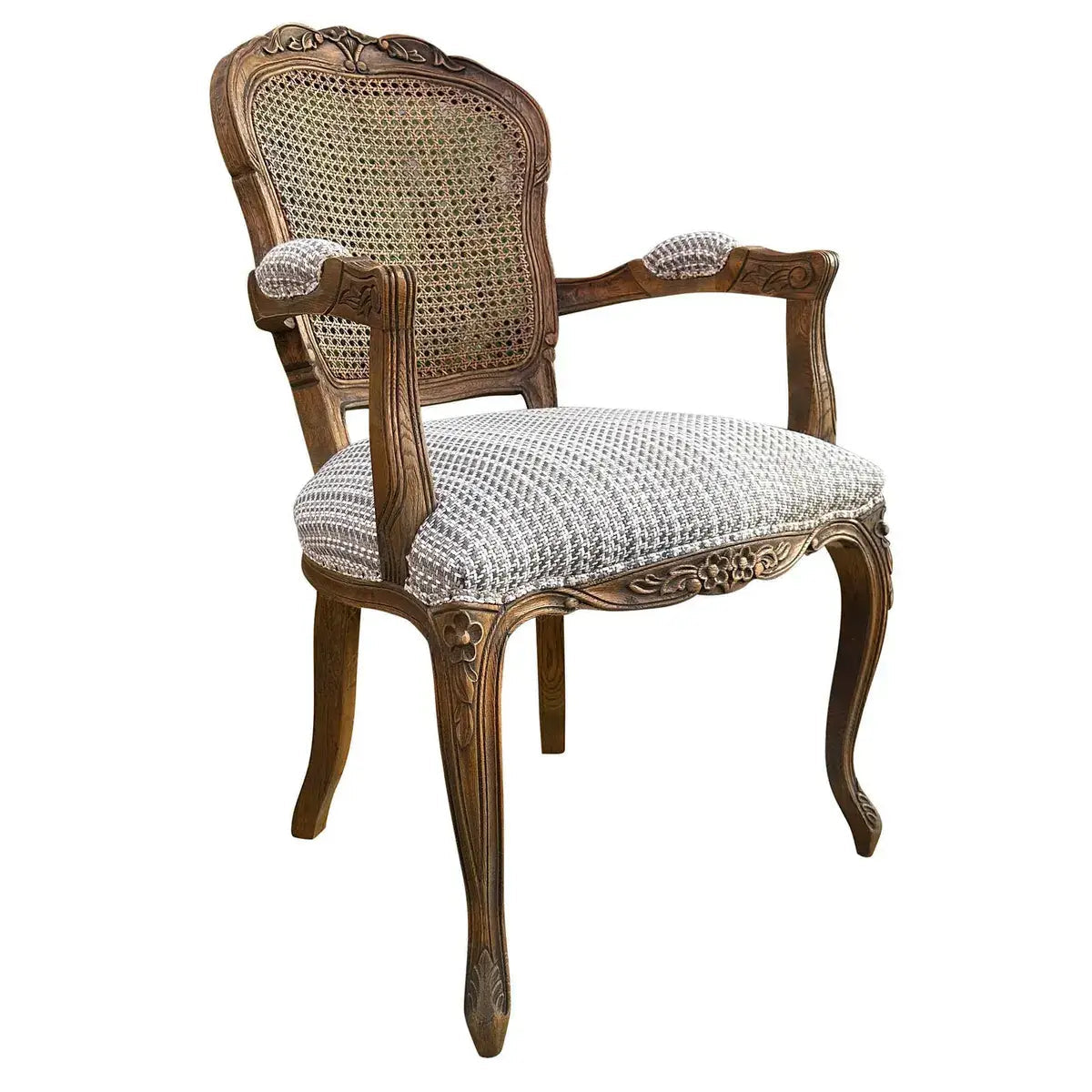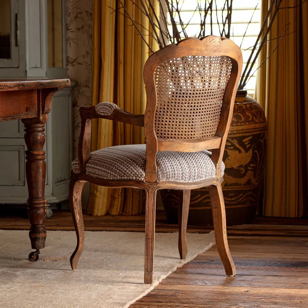 Our Cochin Arm Chair adds vintage charm and elegance to any space, with a carved wooden frame, classic cane back, and neutral upholstered seat, it blends rustic sophistication with timeless design.