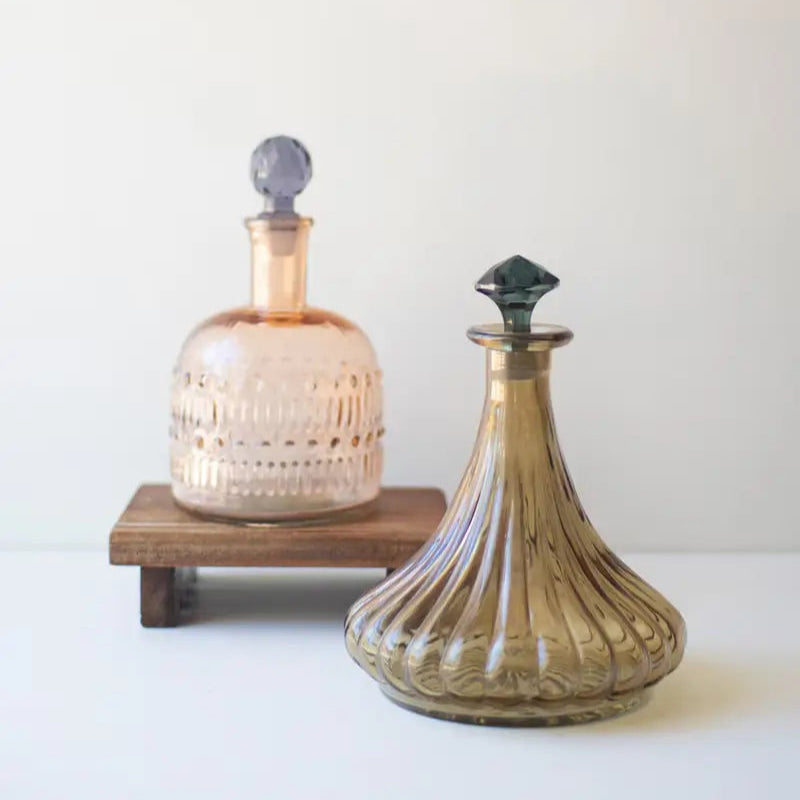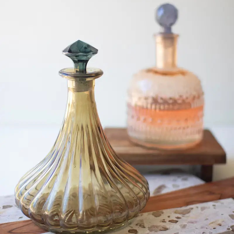 These glass decanters, featuring a beautifully crafted embossed glass design in elegant translucent hues, are perfect for adding sophistication with a timeless vintage feel while serving anything from fine spirits to infused oils.