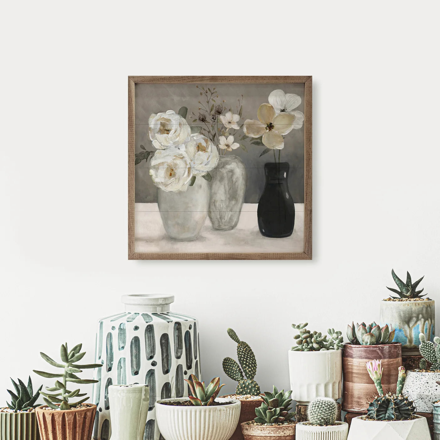 This vintage style wood print, featuring a walnut wood frame with a trio of beautiful neutral flowers in contrasting vases printed on a shiplap background, is sure to provide beauty and farmhouse charm to any space.