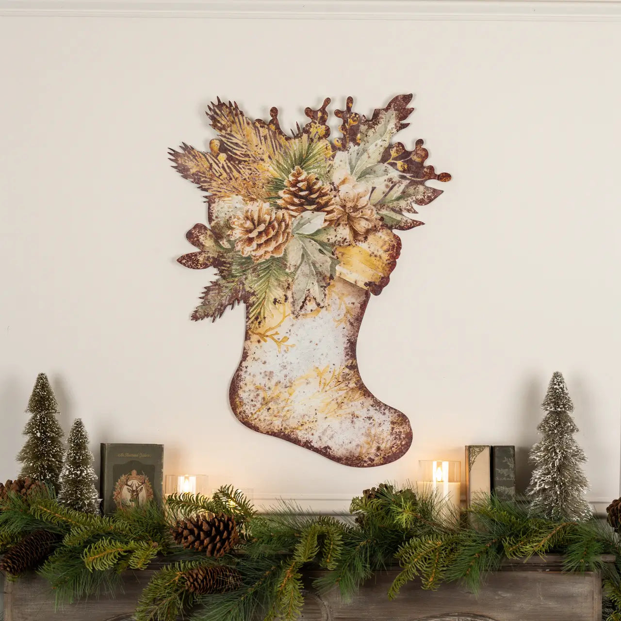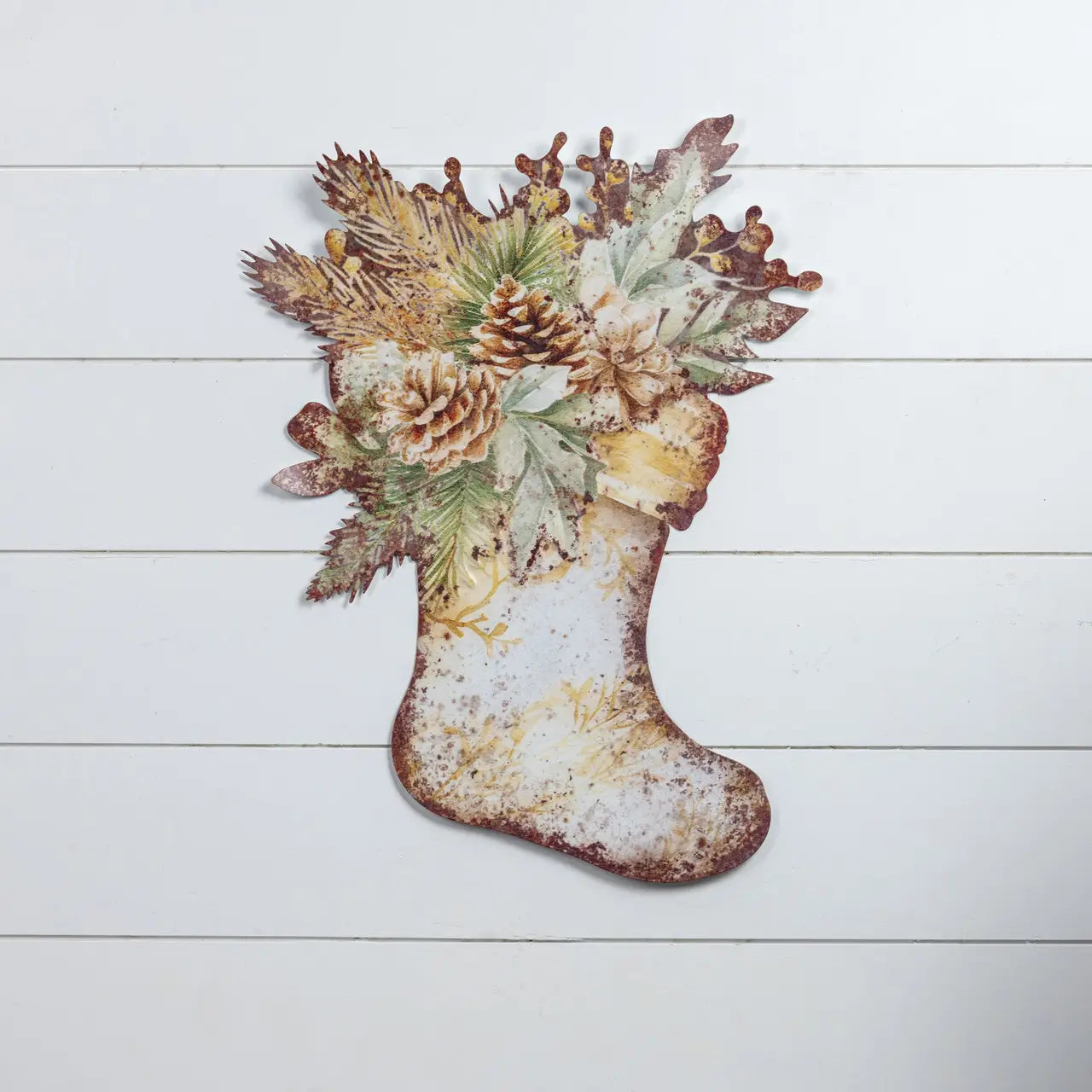 This distressed metal stocking wall decor features festive greenery and pinecones, adding a vintage, weathered charm to your holiday mantel or wall display.