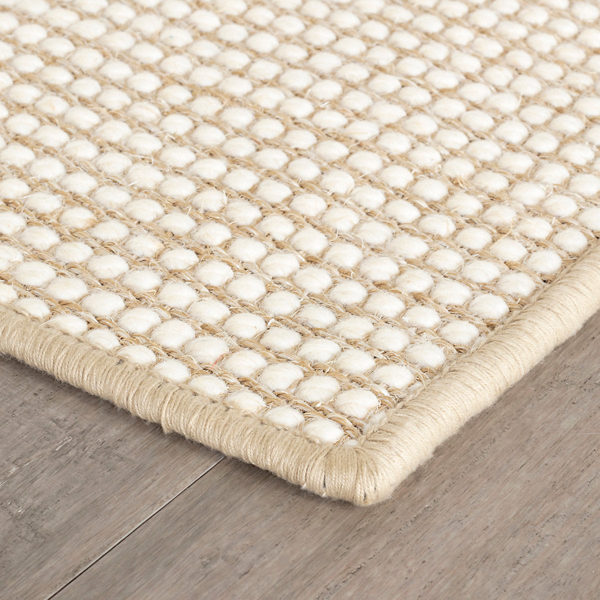 This rug brings rustic earthy charm to any interior with low profile dramatic texture in hardworking classically colored jute for durability and ivory wool for warmth, it can grace any room with a natural, understated style.