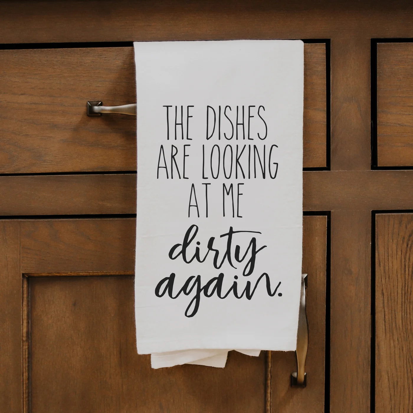 With its whimsical message, our Dirty Dishes dishtowel, featuring a black and white print of a the words "The Dishes Are Looking At Me Dirty Again" makes a whimsical gift for yourself or someone special.
