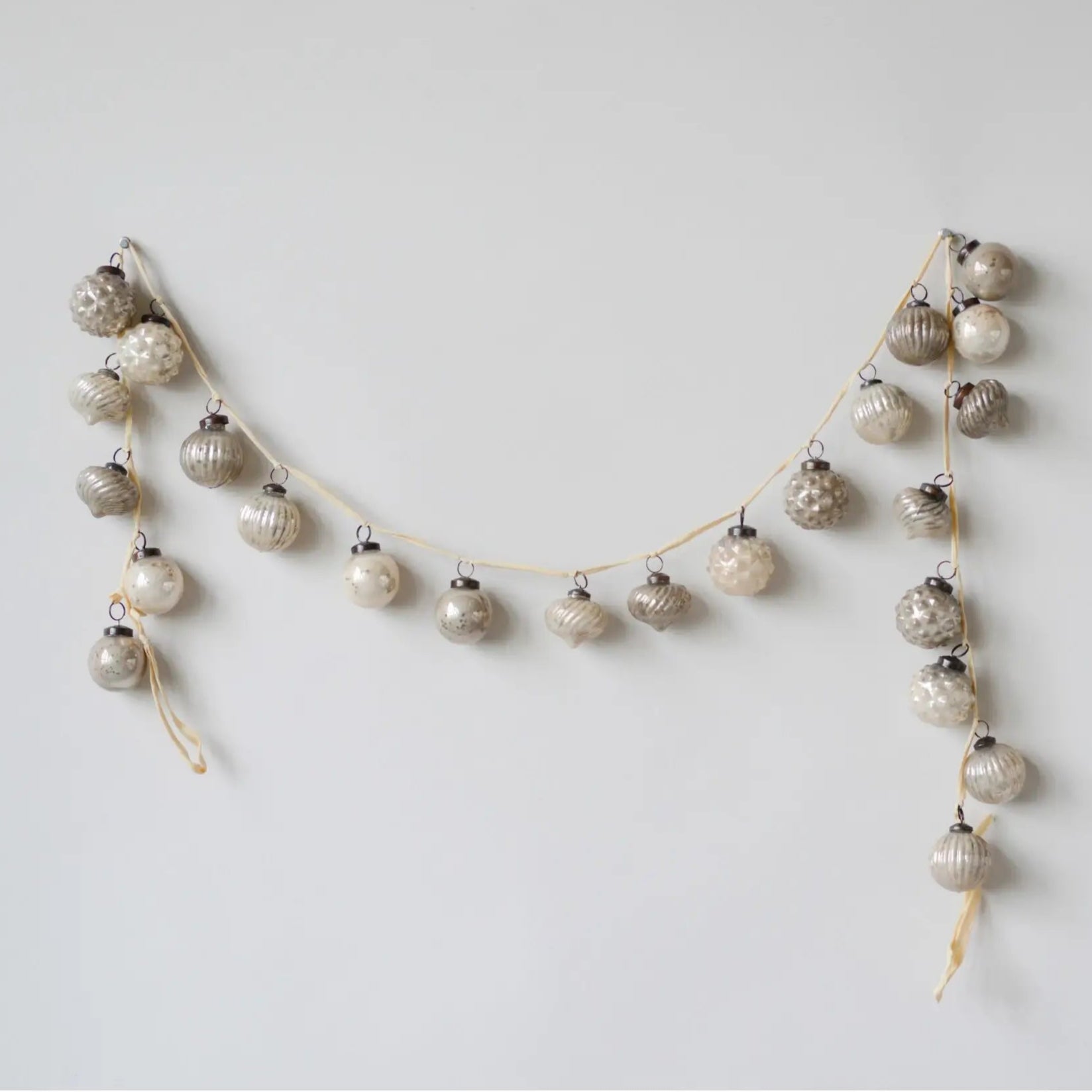 This antique inspired glass garland features a mix of beautifully textured ornaments on a soft velvet ribbon, perfect for draping across a mantel, tabletop, or window for a touch of vintage holiday charm.