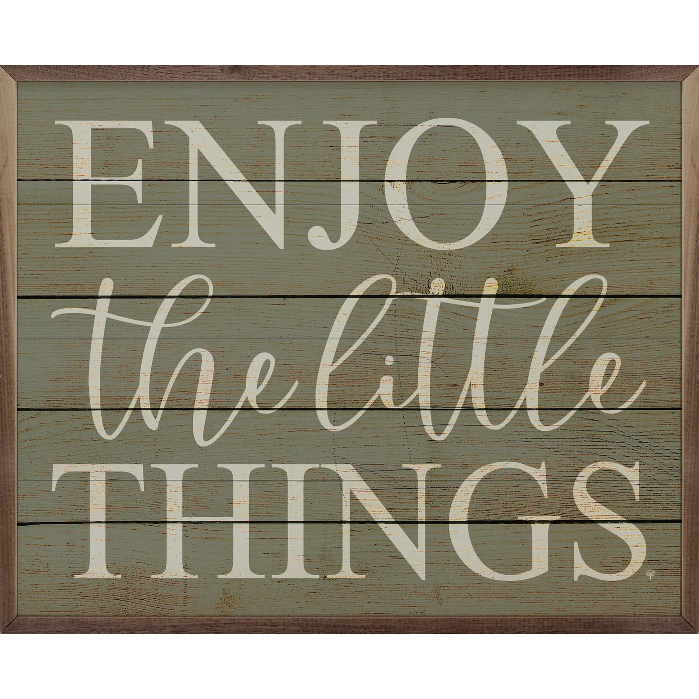 This sweet wood print, featuring a walnut wood frame and the words "Enjoy The Little Things", is sure to provide beauty, inspiration and farmhouse charm to any home.