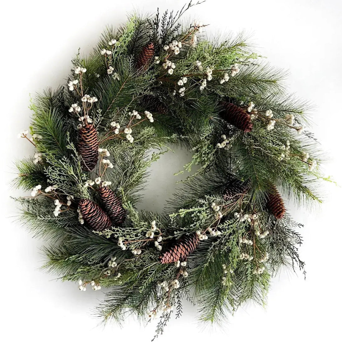 This evergreen snowberry wreath brings a cozy cottage feel with its mix of soft pine, white berries, and natural pinecones, perfect for a simple, wintery welcome.