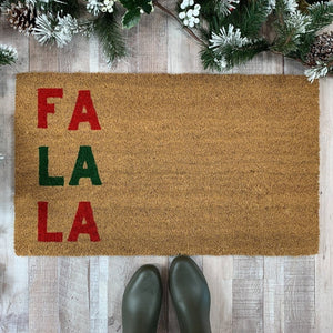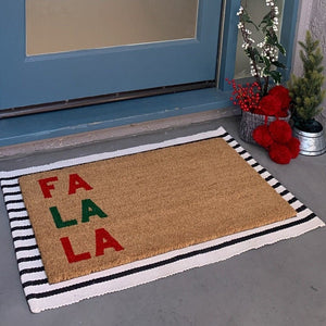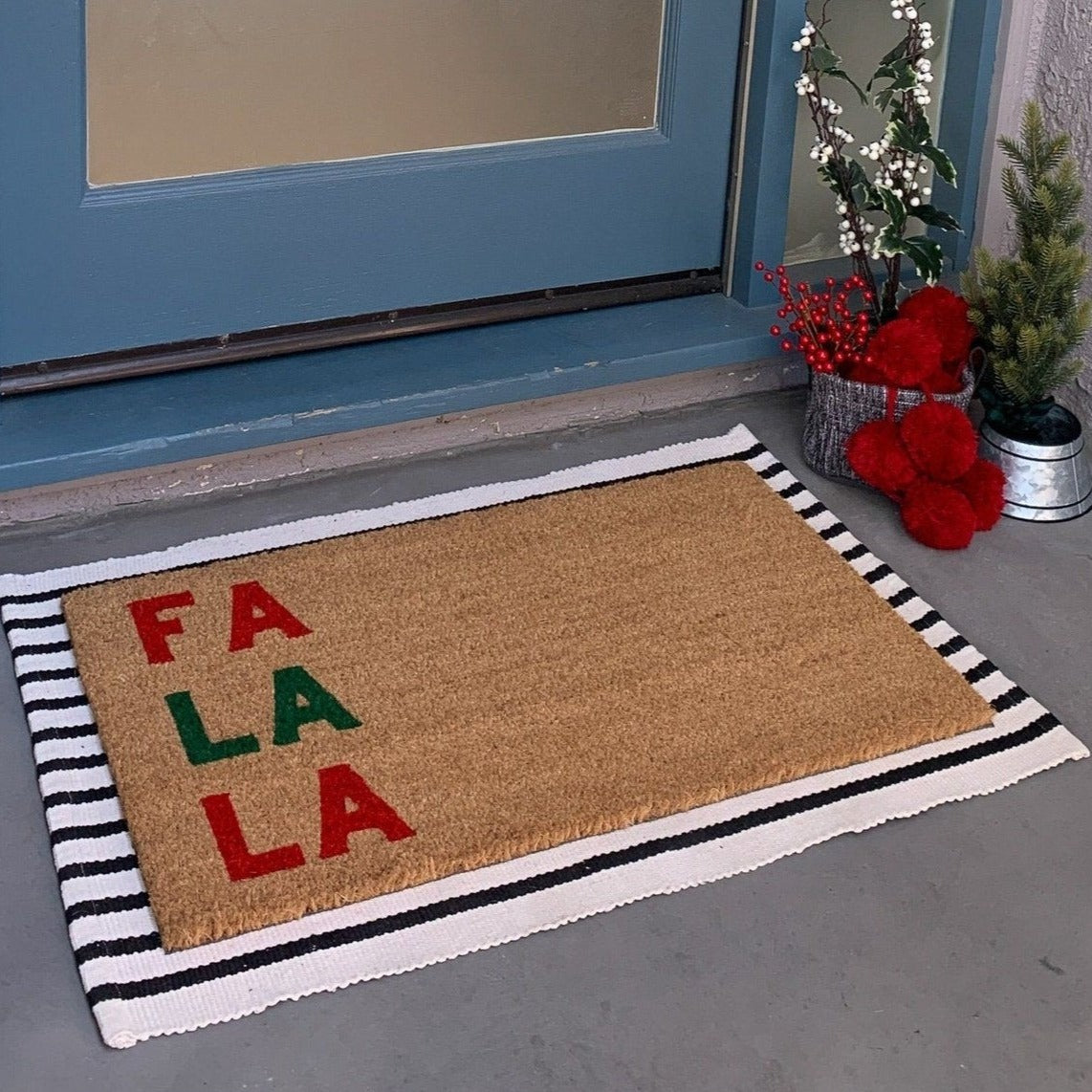 Welcome guests this holiday season with our whimsical FA LA LA doormat, made by hand with red and green lettering, this doormat is sure to add a whimsical holiday feel without sacrificing functionality this holiday season.