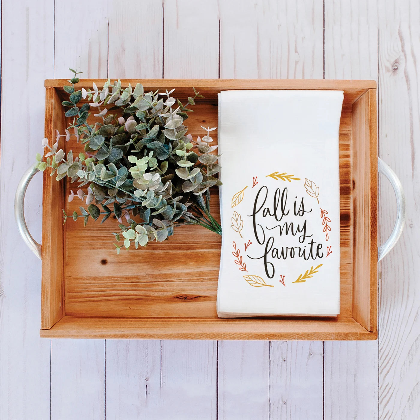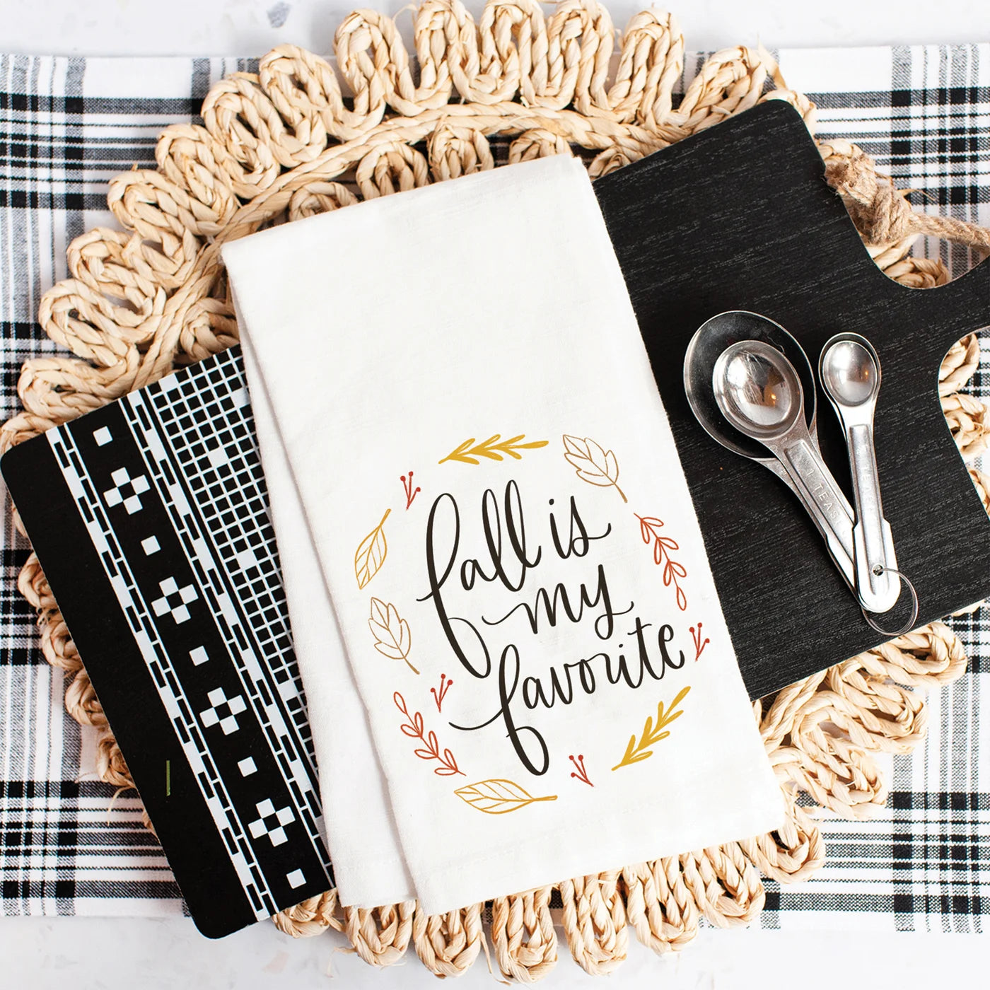 Spread the autumn feel throughout your kitchen with our Fall Is My Favorite dishtowel, featuring the words "Fall is my favorite" whimsically scripted within a wreath of Fall florals, this towel adds a touch of whimsy and warmth to your home the holidays.