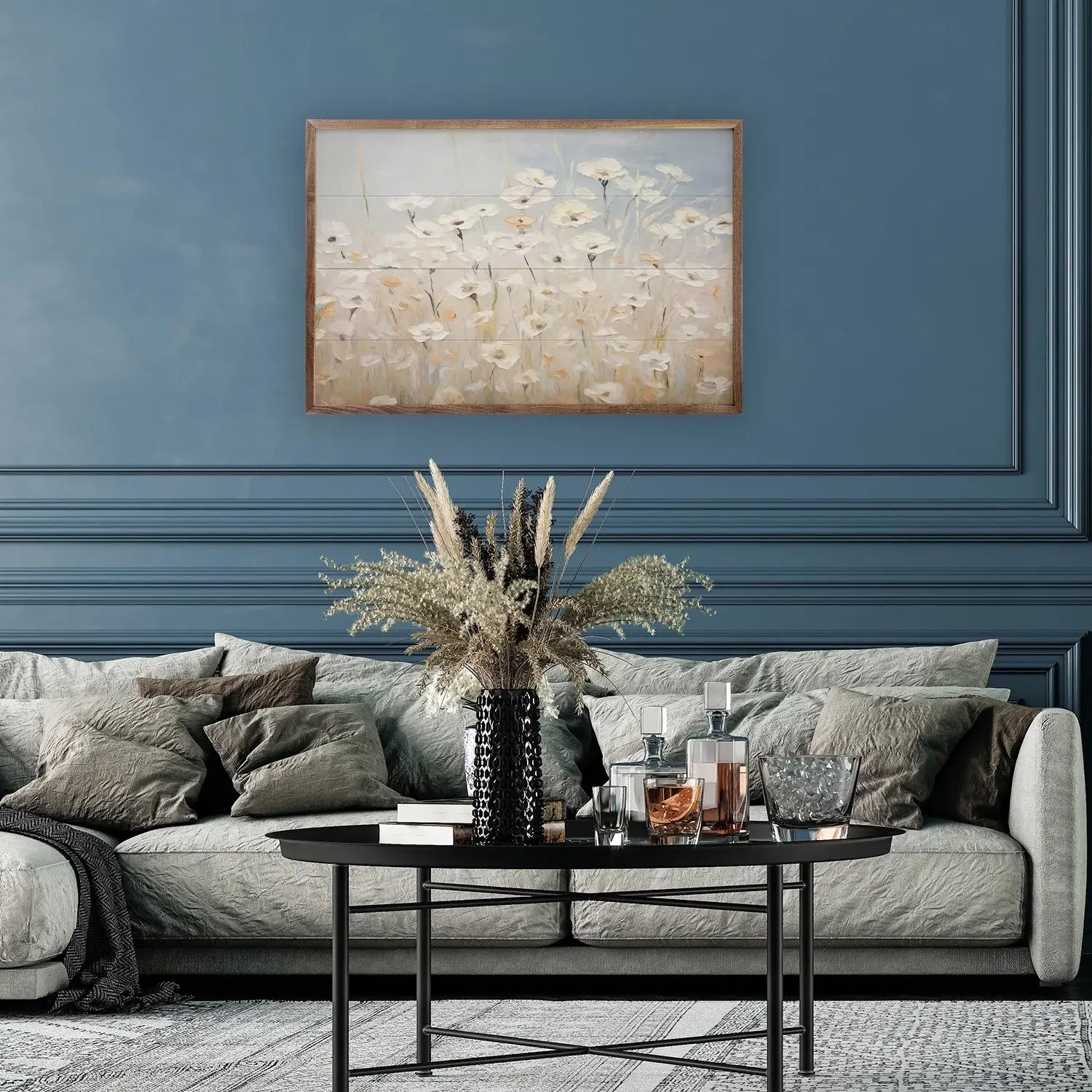 This beautiful wood print, featuring a walnut wood frame with a beautiful field of white poppies painted on a shiplap background, is sure to provide beauty and farmhouse charm to any space in your home.