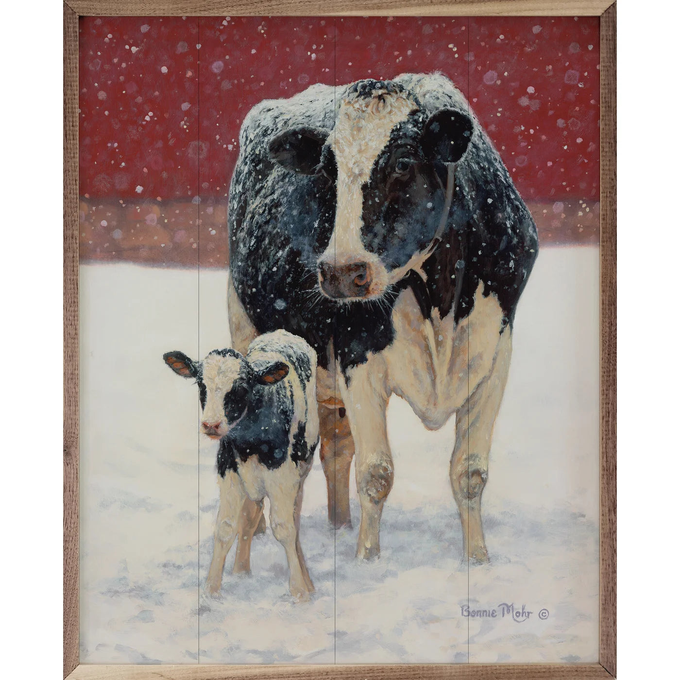 This sweet vintage style wood print, featuring a walnut wood frame and a mother cow and her calf on a snowy day outside the barn printed on a shiplap background, is sure to provide beauty and farmhouse charm to your home this holiday season.