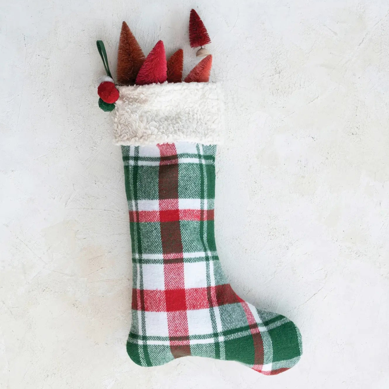 Cozy up your mantel with this soft flannel stocking, featuring a classic red and green plaid pattern, a fuzzy sherpa cuff, and sweet pom pom accents, it is a festive farmhouse touch for the holidays.