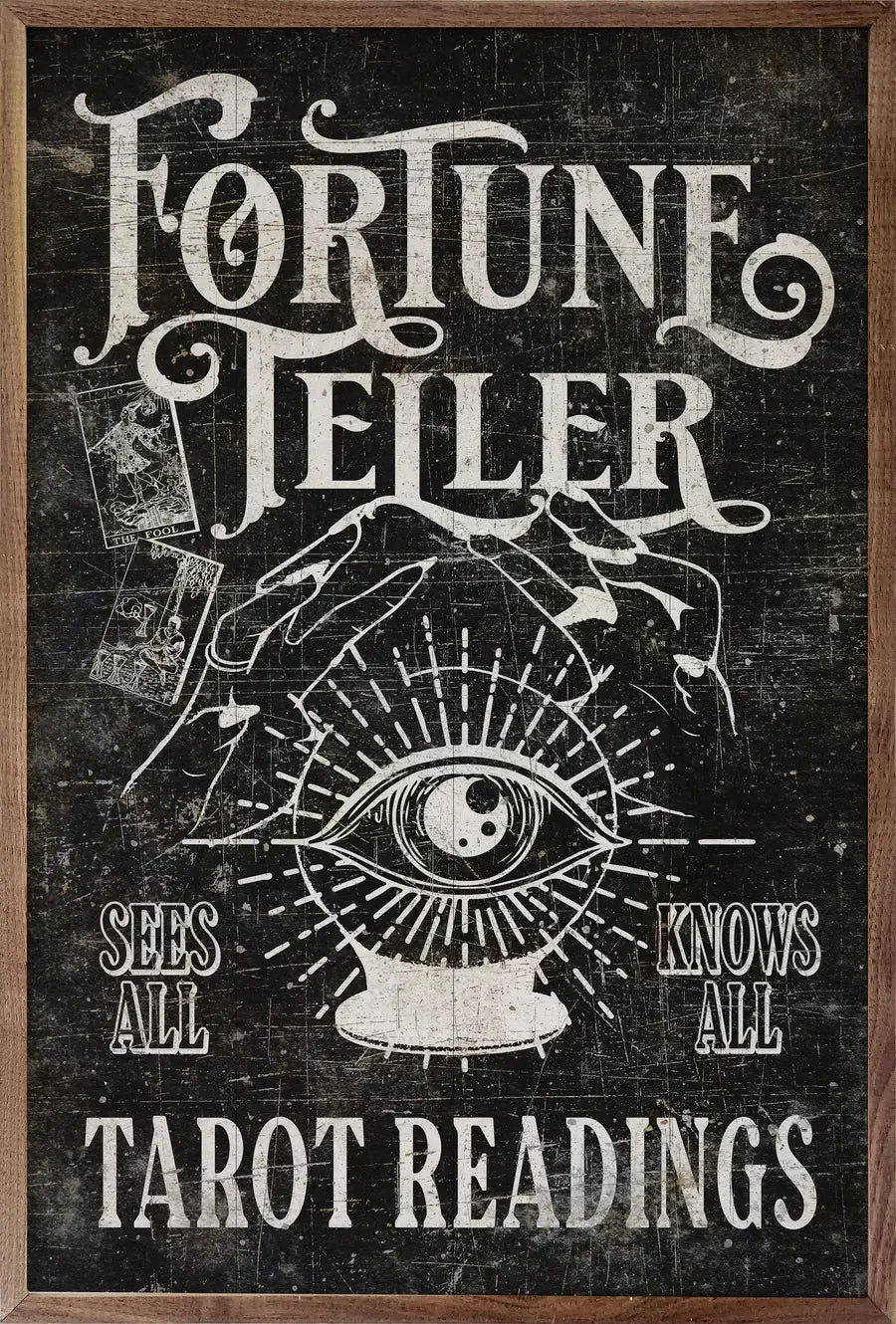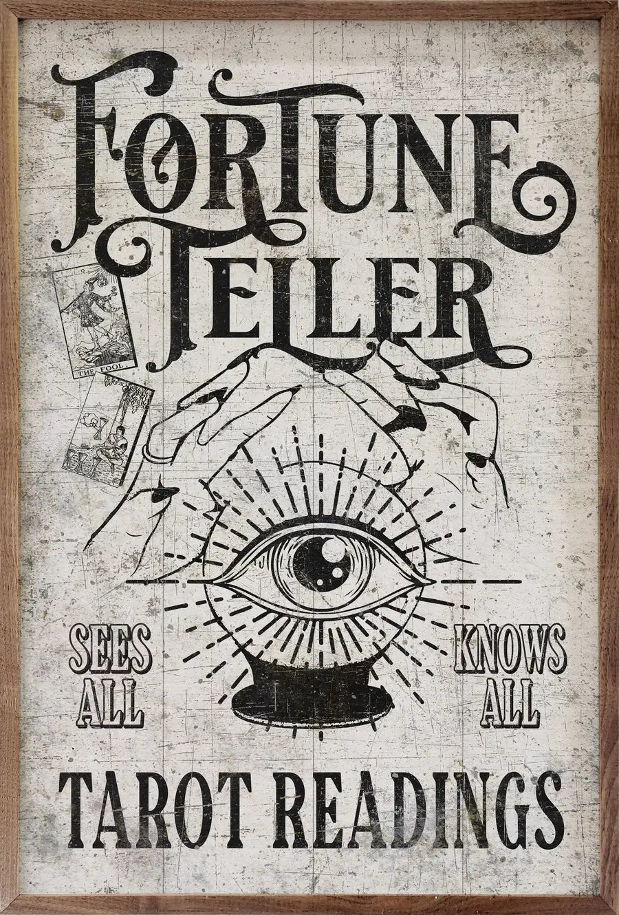 Add a touch of vintage charm to your cottage decor with this whimsical Fortune Teller sign, featuring a shiplap style background, walnut wood frame, and hand drawn details, it’s perfect for adding a little mystery and personality to any cozy corner this Halloween.