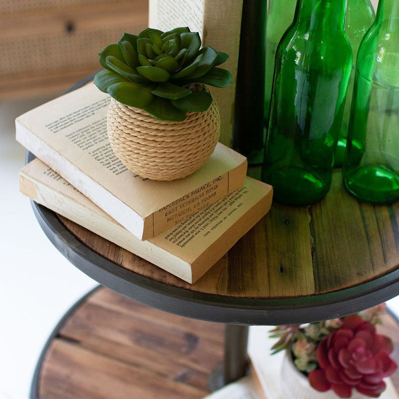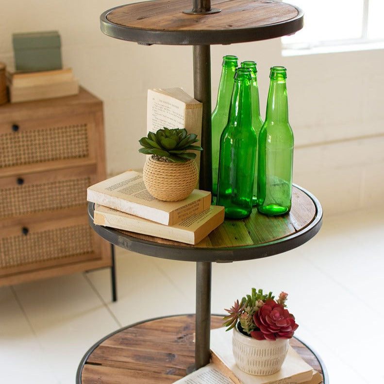 This beautiful four tier stand, featuring a metal frame and stand with four reclaimed wood trays and top metal handle, is a beautiful display piece for plants and everyday home decor.