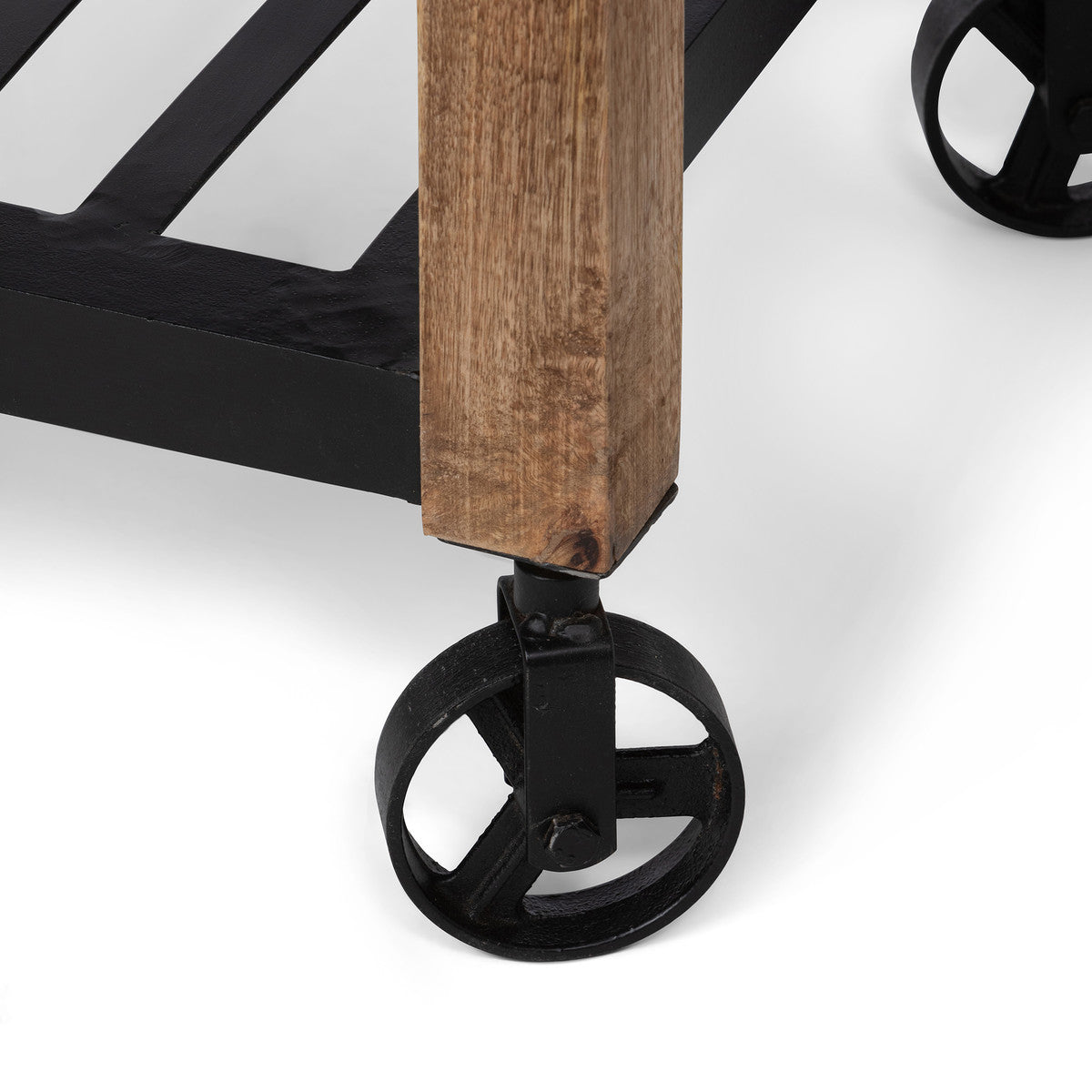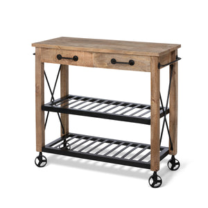 This simple yet beautiful potting cart, made from mango wood and iron with functioning wheels, features two storage drawers for garden gloves or scissors, mounted metal rods on either side for hanging tools or rags, and two slatted metal shelves beneath the work surface for storage or display, making this piece perfect for potting spring flowers and herbs while keeping your space tidy and organized with cottage charm.