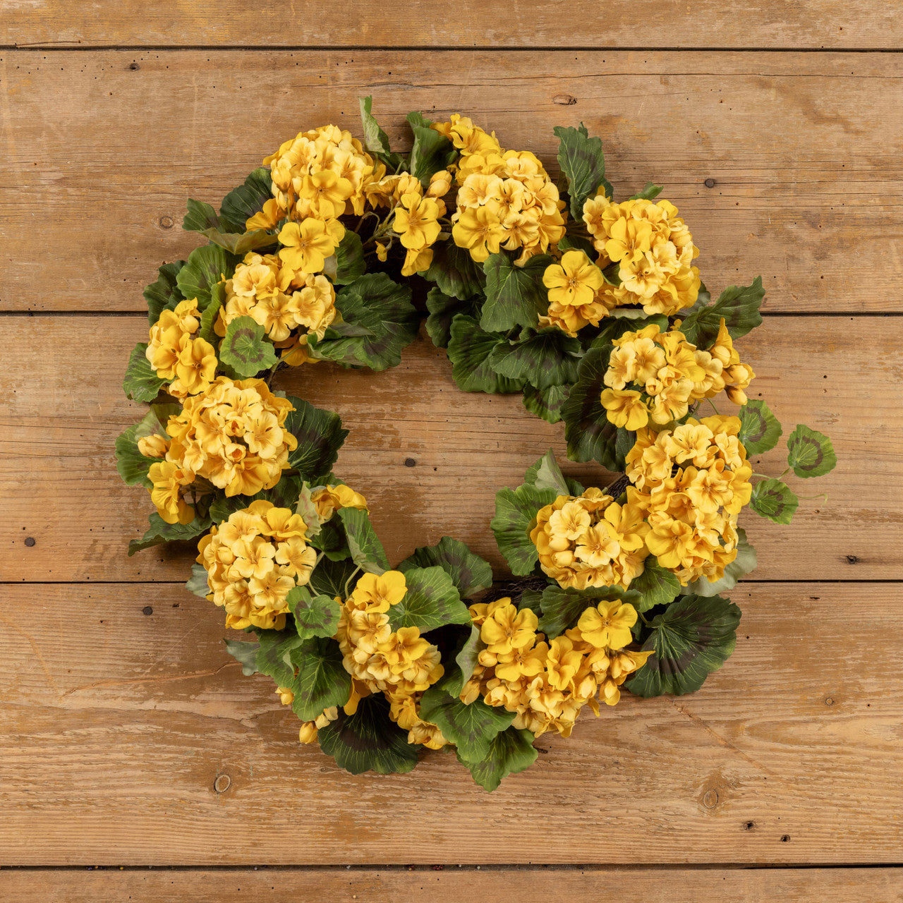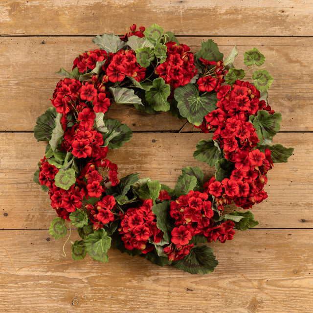 These artificial geranium wreaths, featuring faux geranium florals and greenery, are a beautiful choice for adding a pop of color with farmhouse charm to any place in your home.