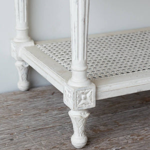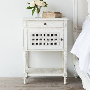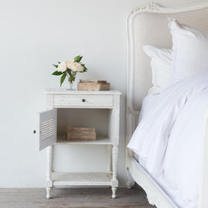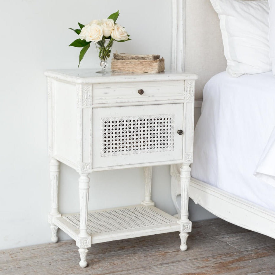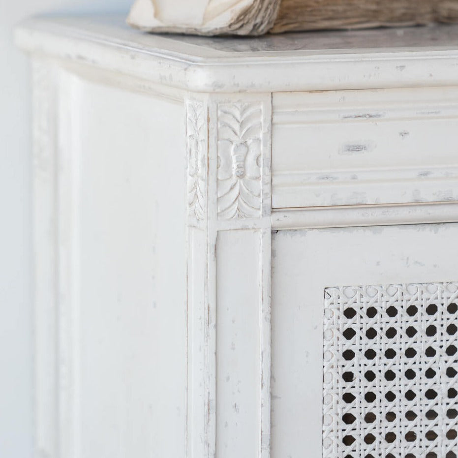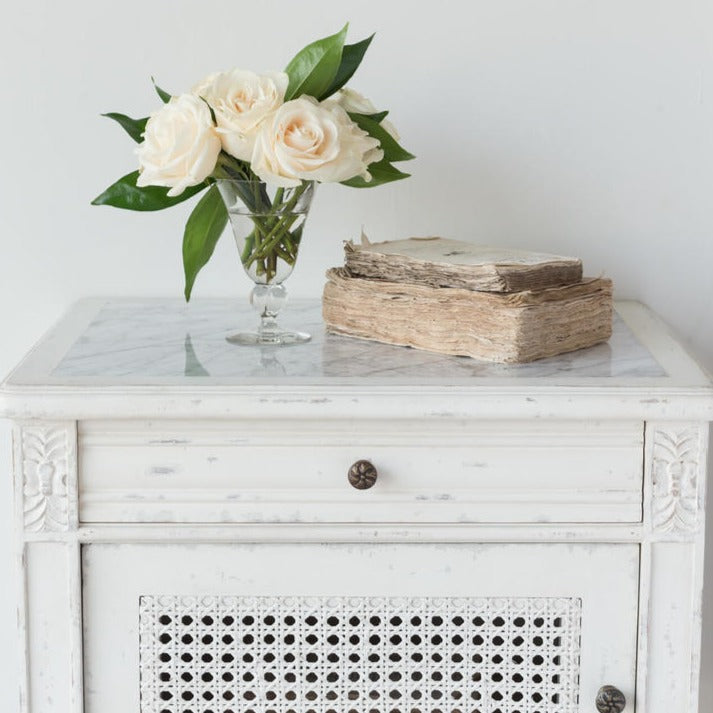 The Giverny Nightstand is a timeless piece modeled in the Louis XVI style with simple, hand-carved fluted legs and rosettes. This nightstand offers both provincial charm and functional storage with its single drawer and rattan cupboard and bottom shelf. The chic, inset white marble top is a beautiful extra touch that defines the Giverny Nightstand as a piece that will stand the test of time.