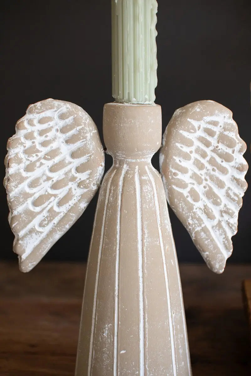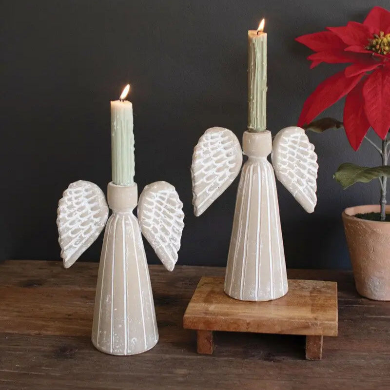 These angel shaped taper holders bring a peaceful, rustic charm to your holiday table or mantel, made of grey washed clay with detailed wings, they're a sweet and simple accent with a cozy, cottage feel.
