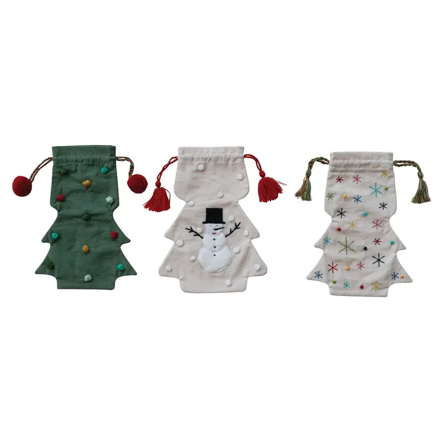 These hand embroidered drawstring wine bags are shaped like little Christmas trees, each with sweet stitched details and soft tassels, they are a charming, cottage style way to gift a bottle or decorate your holiday table.