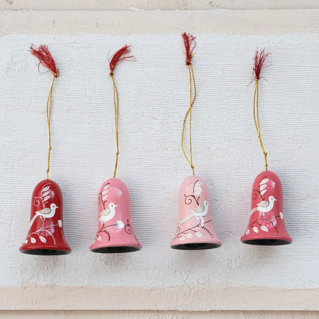 These hand painted wood bell ornaments feature delicate bird and botanical designs in red and pink hues, finished with a playful tassel, they are perfect for adding a cheerful, folk inspired touch to your holiday tree.
