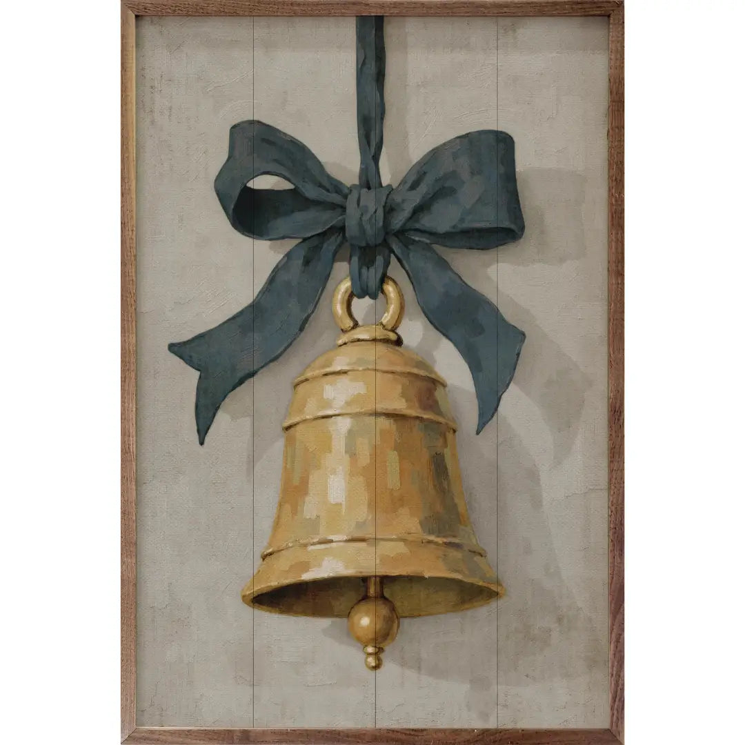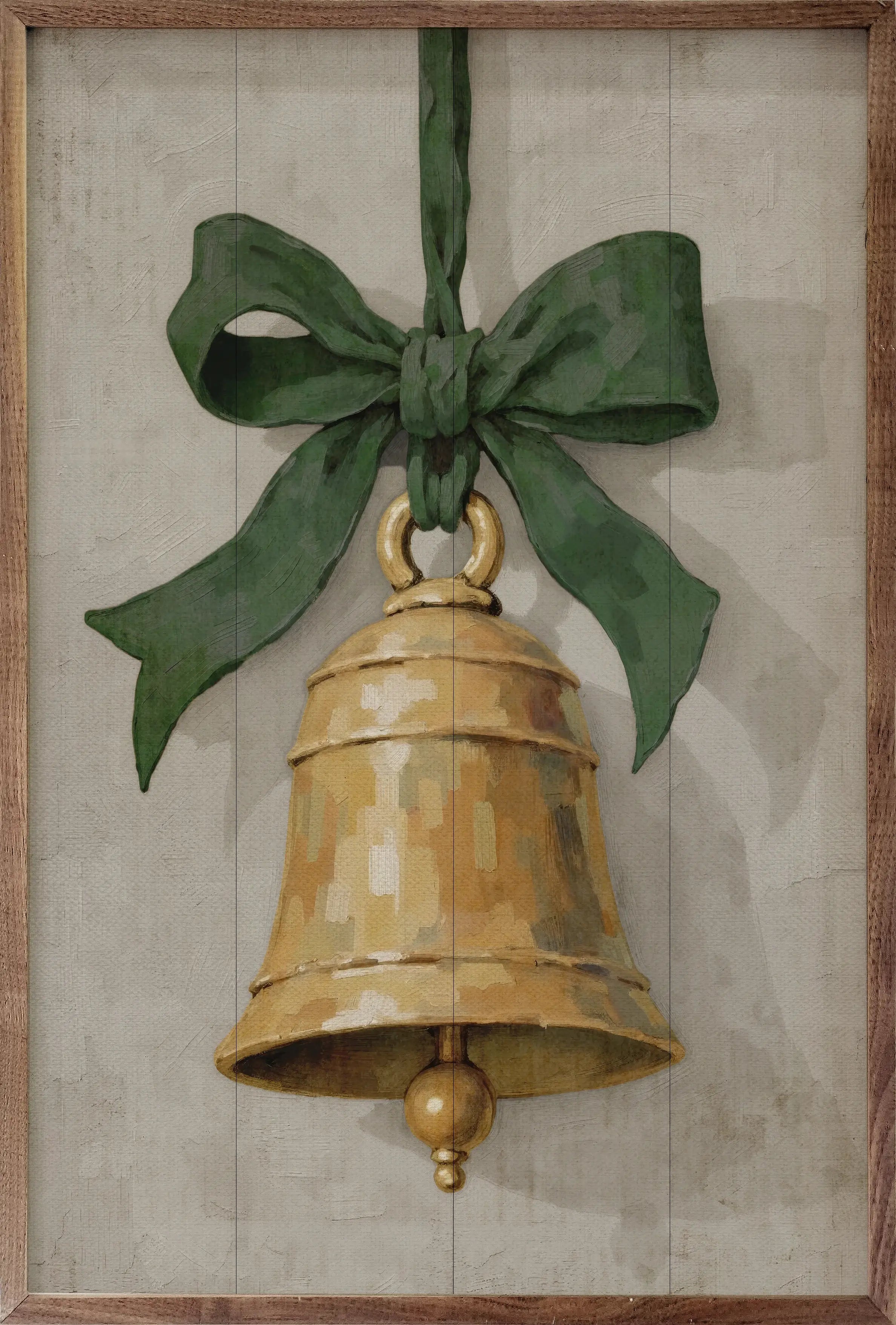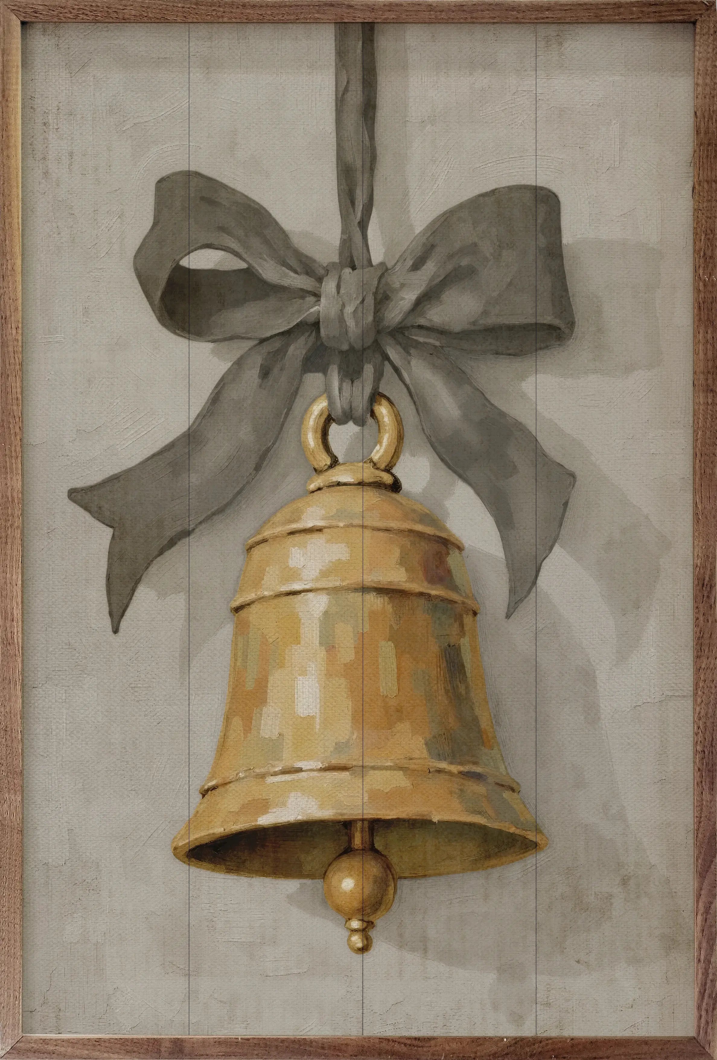 This sweet holiday print features a golden bell tied with a soft colorful ribbon, set against a shiplap style background and framed in warm walnut wood, this charming piece brings classic cottage cheer to your holiday walls.