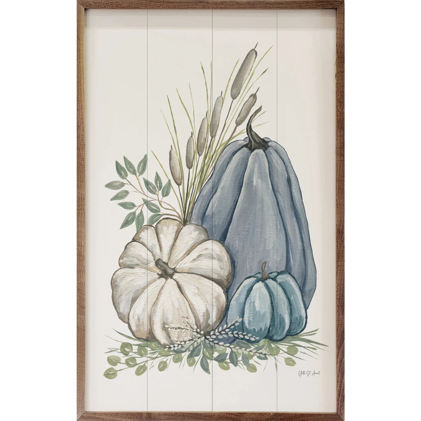This beautiful wood print, featuring a walnut wood frame with a trio of pumpkins in blue or natural colors with coordinating cattails, is sure to provide beauty and farmhouse charm to your home this Fall season.