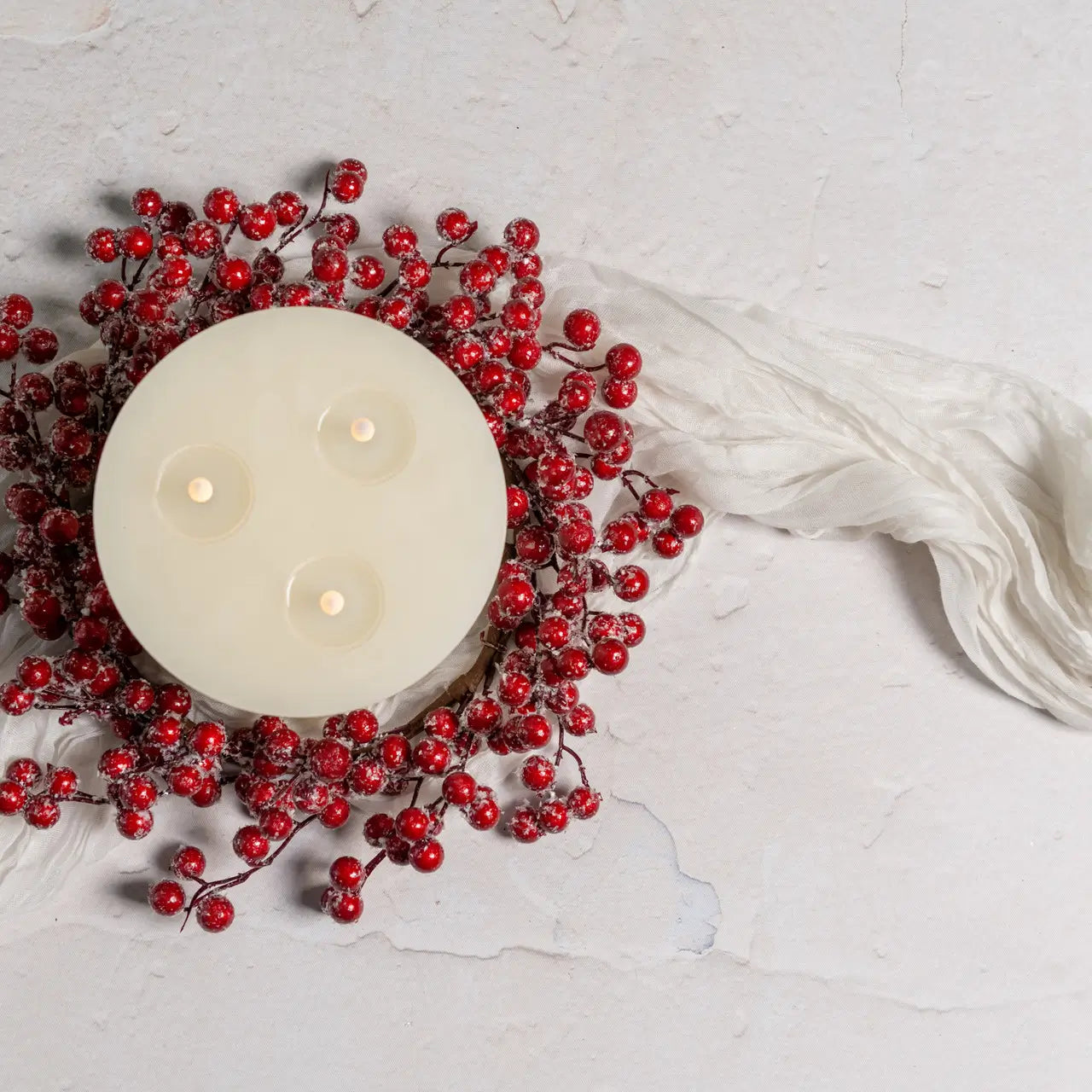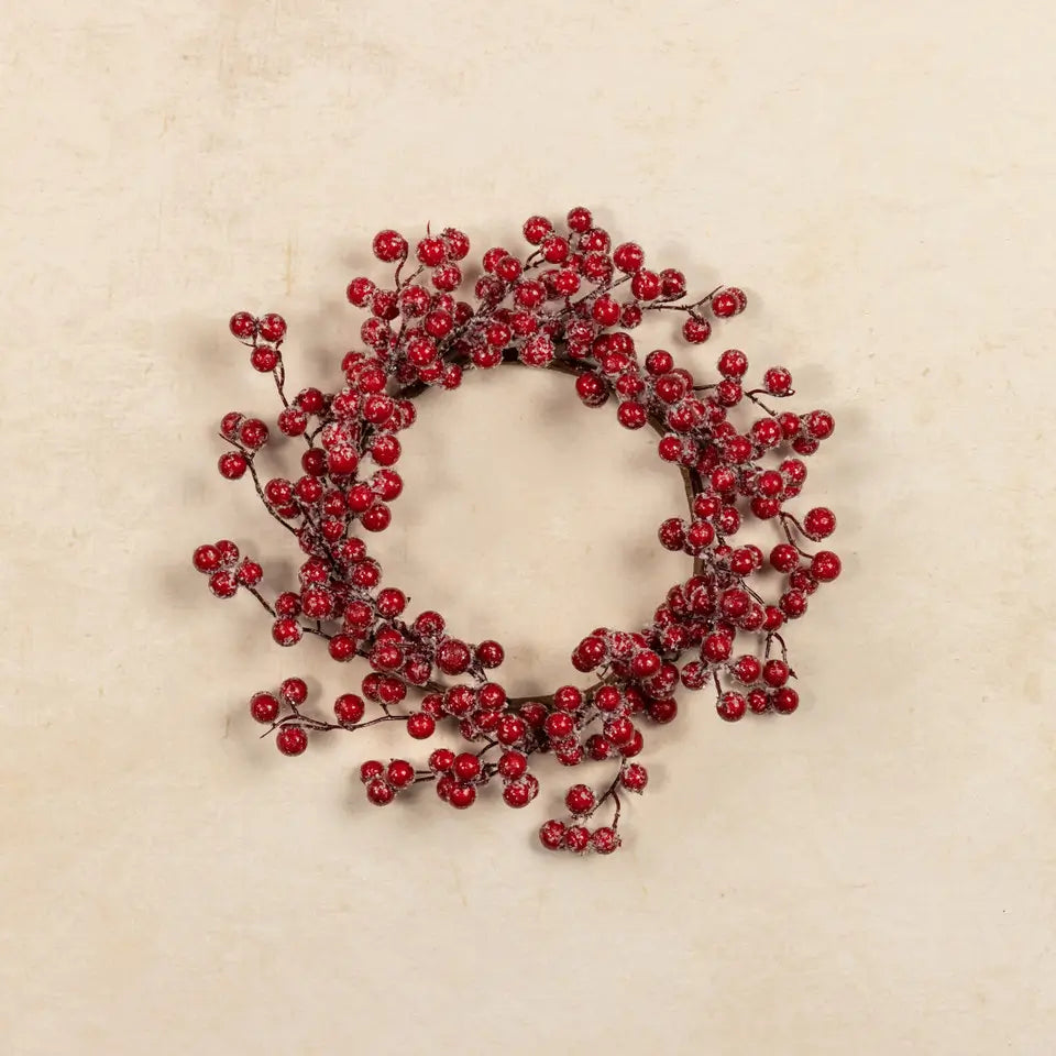 Add a festive cottage touch with these iced red berry candle ring, their dusting of faux frost and vibrant berries feel straight out of a snowy farmhouse morning, perfect around a candle or layered into your holiday tablescape.