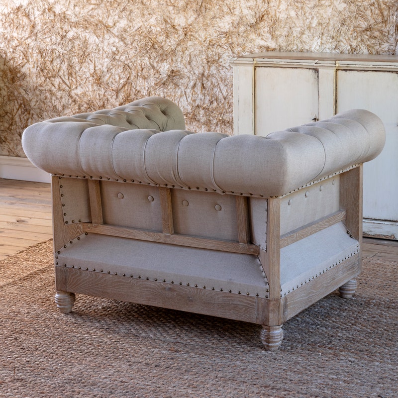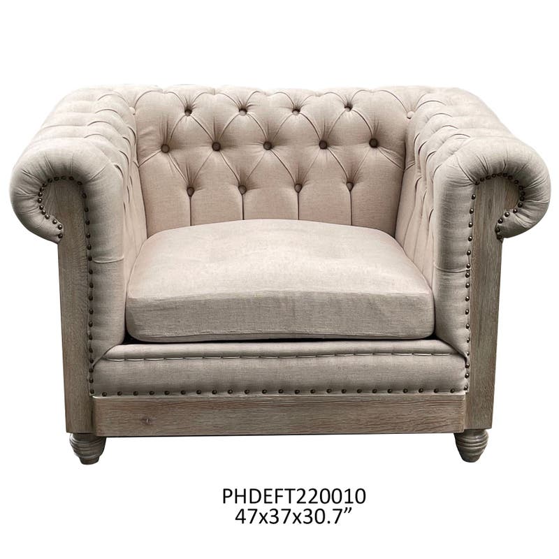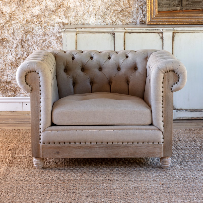 A mix of old school elegance with a modern deconstructed style, our Ivy Hotel Chesterfield Chair is sure to make a statement with a farmhouse feel, featuring high rolled arms, nail head trim, exposed wood with turned bun feet, and a mix of neutral gray fabrics.