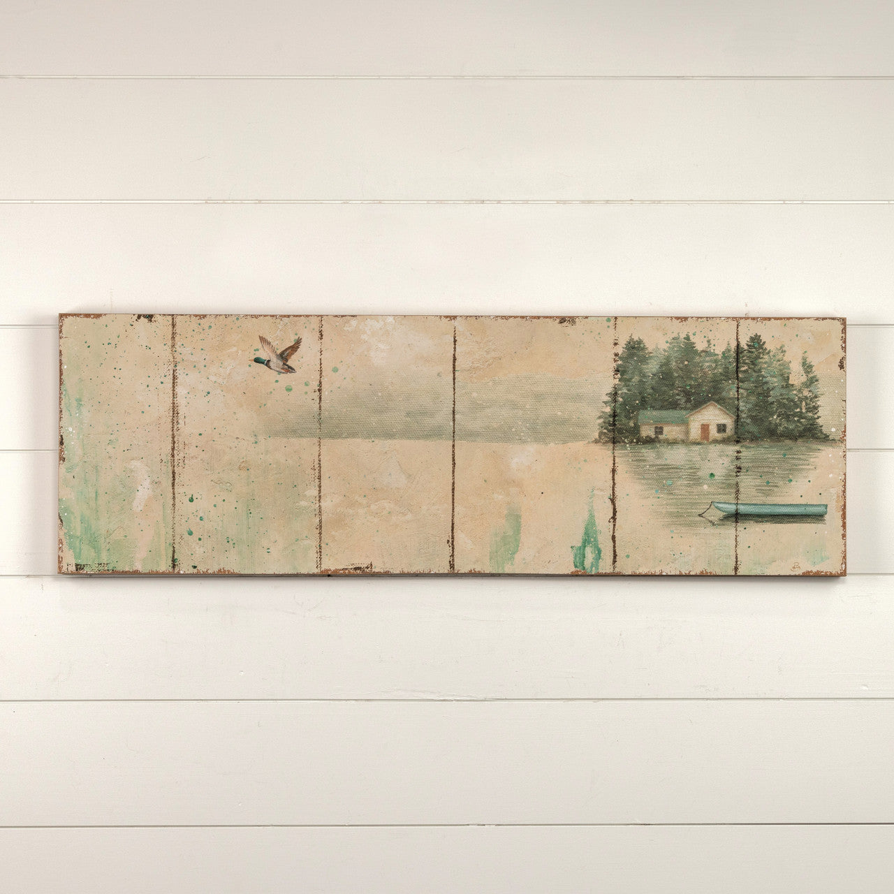 This vintage style print, featuring a beautiful and serene lakeside print that has been aged and distressed, is perfect for adding beauty and inspiration to any farmhouse or cottage style home.