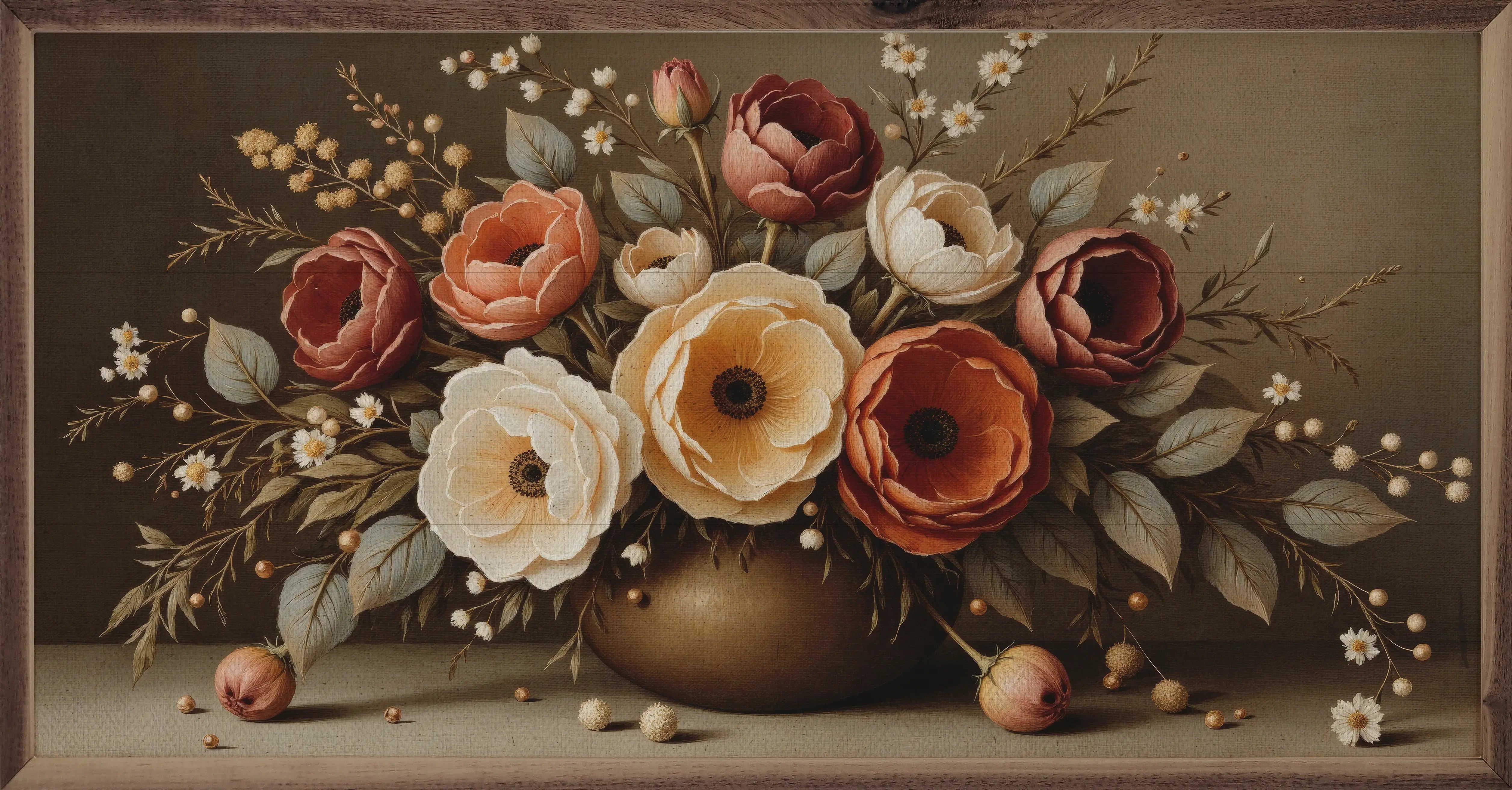 This beautiful print features a warm autumn bouquet that feels straight out of a vintage still life, set against a shiplap style background and framed in rich walnut wood, it brings timeless charm to any cozy corner.