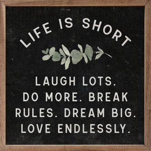 This vintage style wood print, featuring a walnut wood frame with the words "Life is short. Laugh lots. Do more. Break Rules. Dream Big. Love endlessly." printed on a white or black background, is sure to provide inspiration and farmhouse charm to any space.