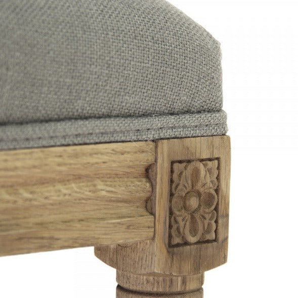 The Lille Grey Bench is constructed from solid wood with beautiful grey upholstery and intricately carved detailing, perfect for adding elegance and a European farmhouse feel to any space.