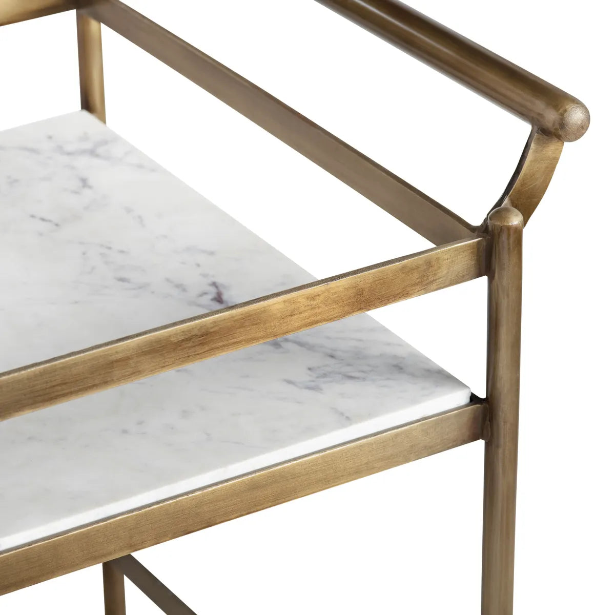 This gorgeous service cart features an elegant combination of antique polished brass and exquisite white marble, making it a perfect addition to any event or home, while its timeless design and beautiful construction provide a sophisticated touch to your hosting and serving needs.