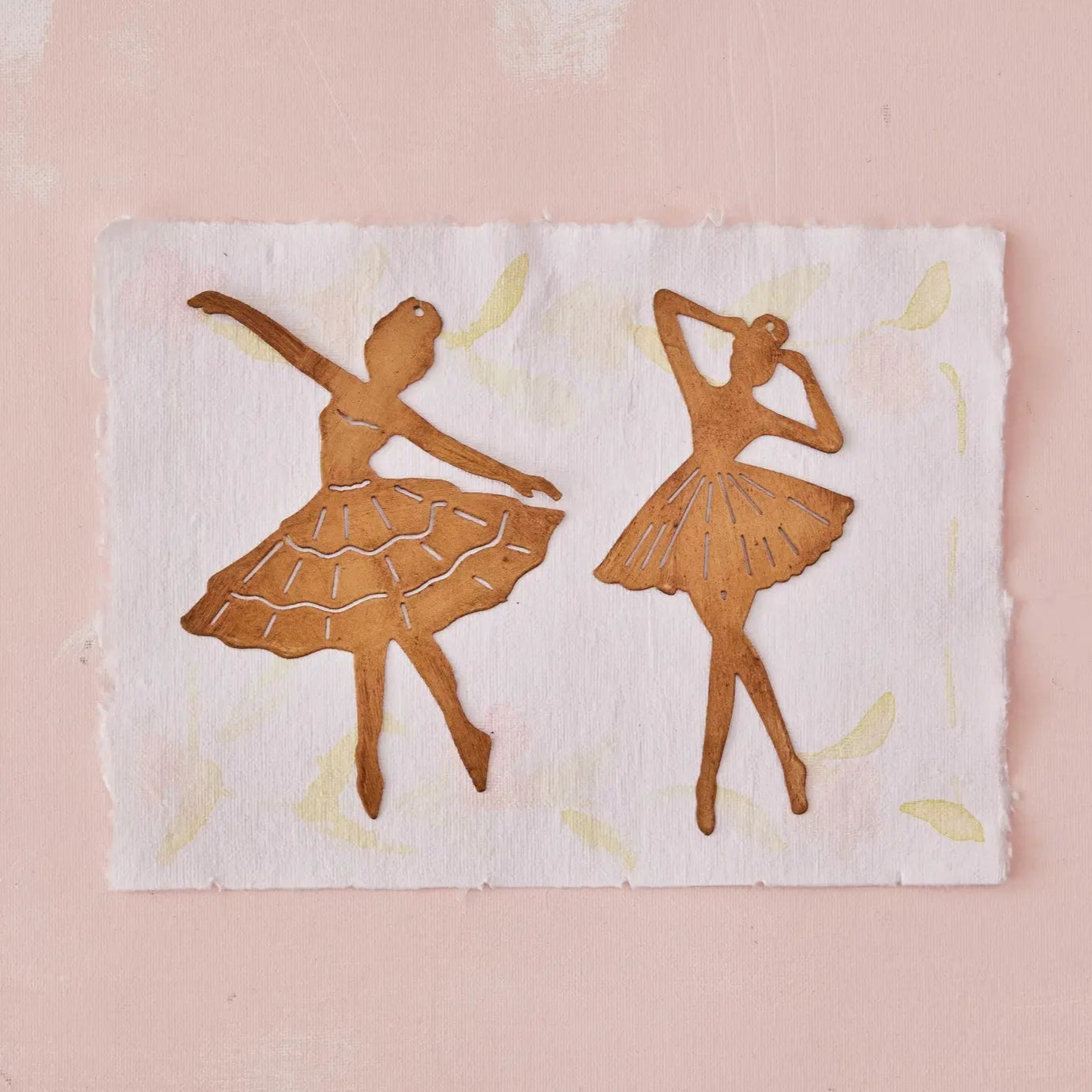 This set of metal ballerina ornaments, featuring an antique brass finish, brings graceful charm and vintage elegance to any holiday decor.