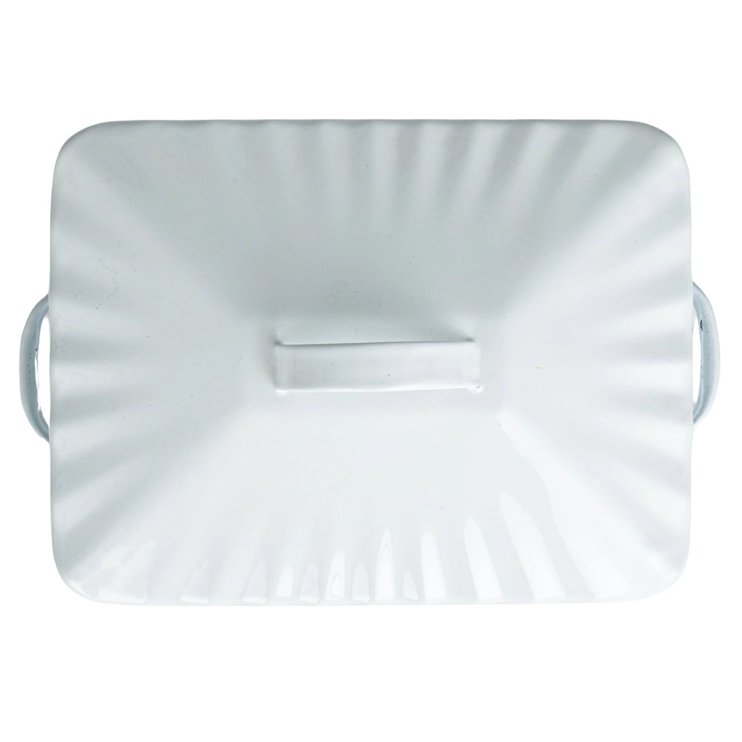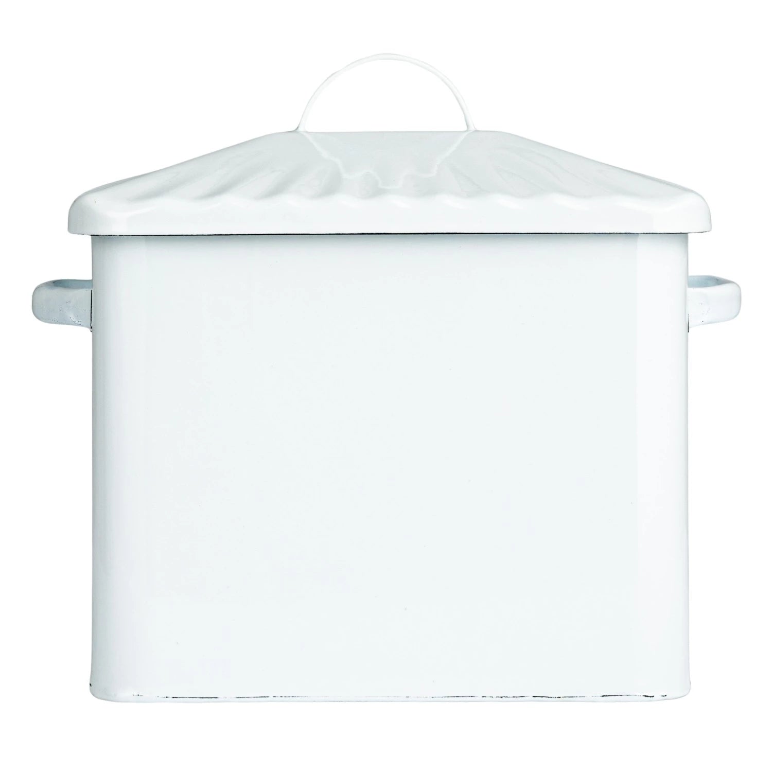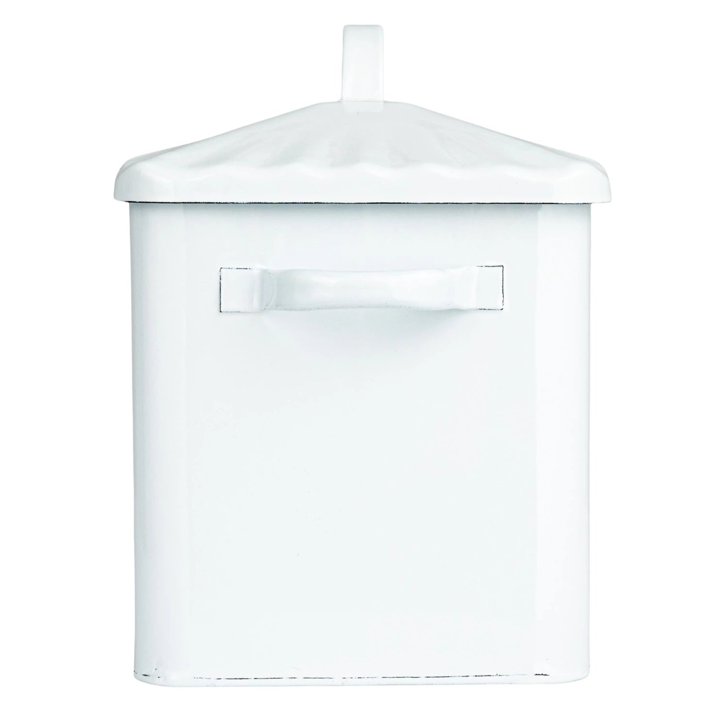 This metal bread box is sure to add a little farmhouse charm to your kitchen with its lightly distressed white metal exterior and matching lid with the simple word BREAD displayed across the front in a navy blue font.