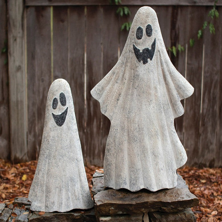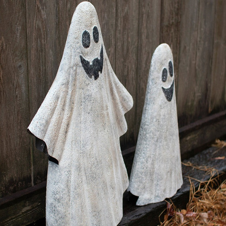 This Metal Ghost Set, featuring two whimsically spooky ghosts in a distressed metal finish, are sure to provide whimsy and vintage charm to any space this Halloween and Fall.