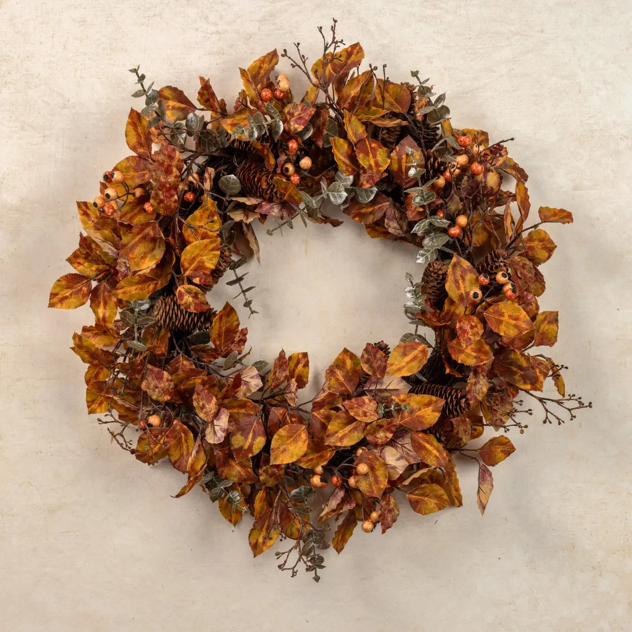 This mixed fall foliage wreath brings all the cozy autumn feels, layered with warm leaves, berries, and pinecones, it looks like as though it was gathered from a crisp woodland walk.