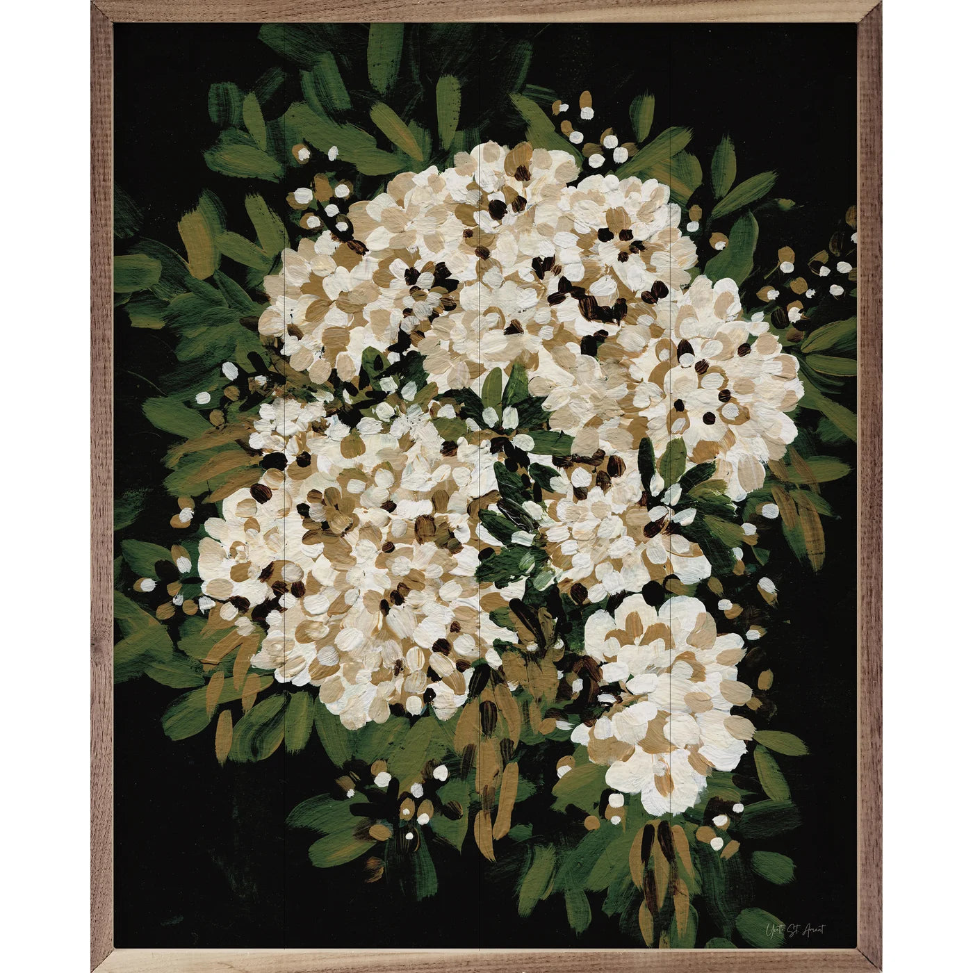 This vintage style wood print, featuring a walnut wood frame and a beautiful bouquet of flowers on a moody black shiplap background, is perfect for adding beauty and a touch of drama to any farmhouse or Cottagecore style home.