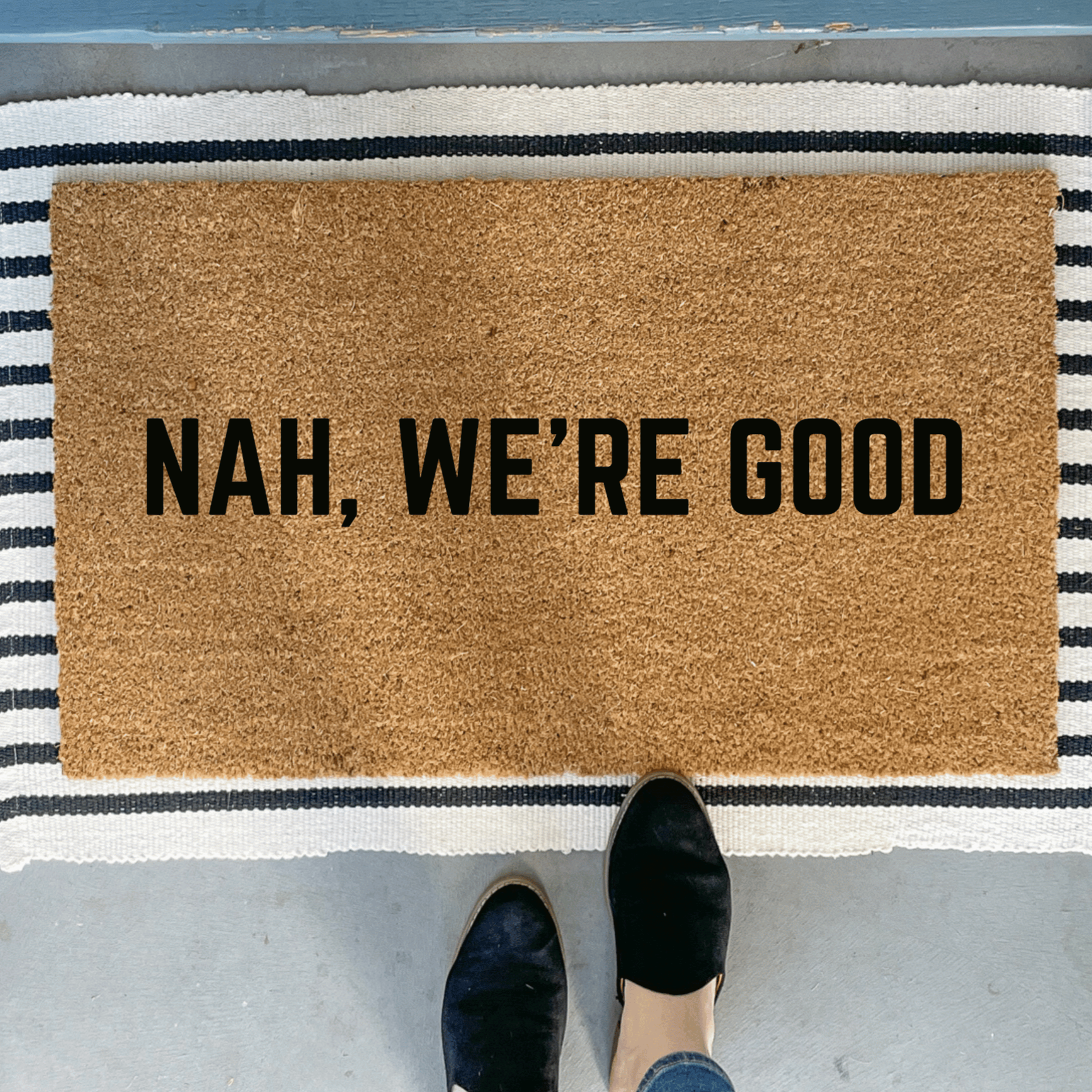 Keep unwanted visitors at bay with this hand-crafted "Nah, We're Good" doormat or, at the very least, leave them with a smile with this whimsical doormat.