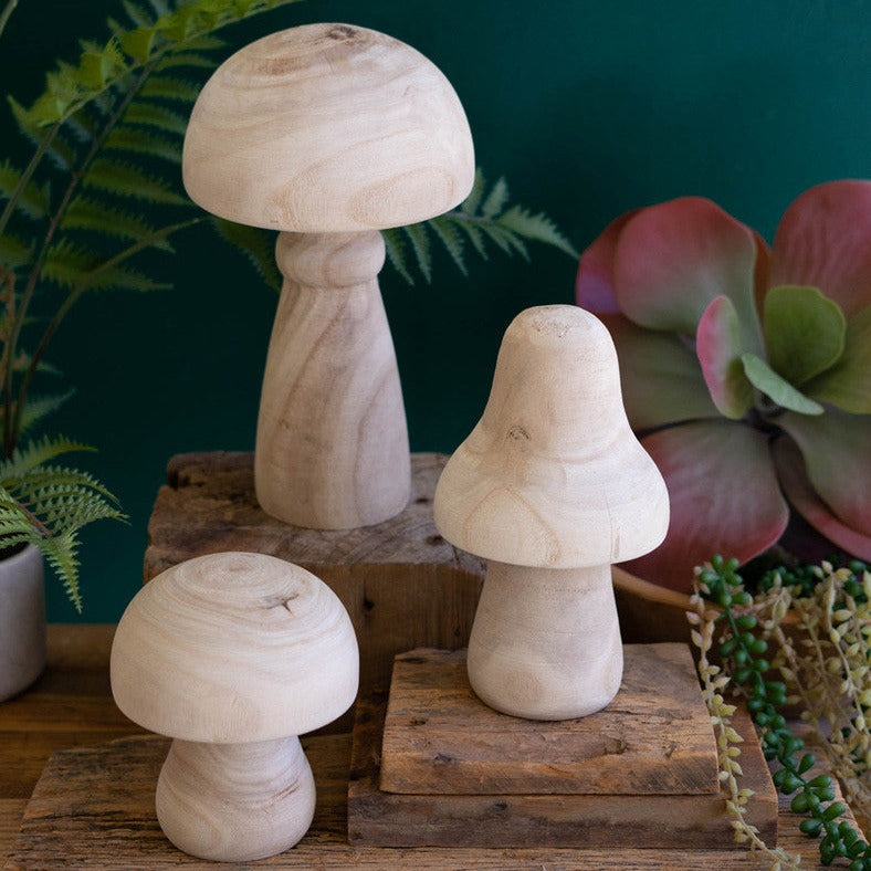 These sweet natural wood mushroom, featuring three different shapes and sizes in a neutral natural wood finish with each one organic looking and unique, are perfect for adding a beautiful Cottagecore feel to any table centerpiece or mantel display.