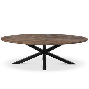 If you are looking for a unique statement piece to anchor your dining space, the Nolan Crossed Leg Oval Dining Table is exactly what you need, featuring a tabletop artisan crafted from recycled elm wood and an eight way iron hand tied suspension base, this table is sure to be the focal point of any dining room or foyer.