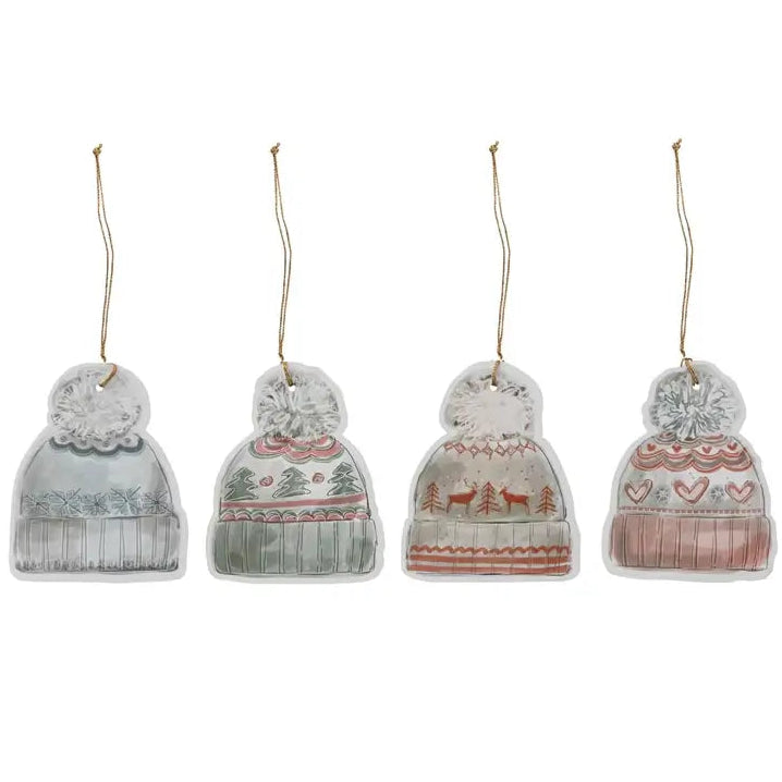 This set of four hat ornaments features cozy winter hat designs with charming holiday patterns, a sweet and whimsical touch for your tree or holiday gifting.