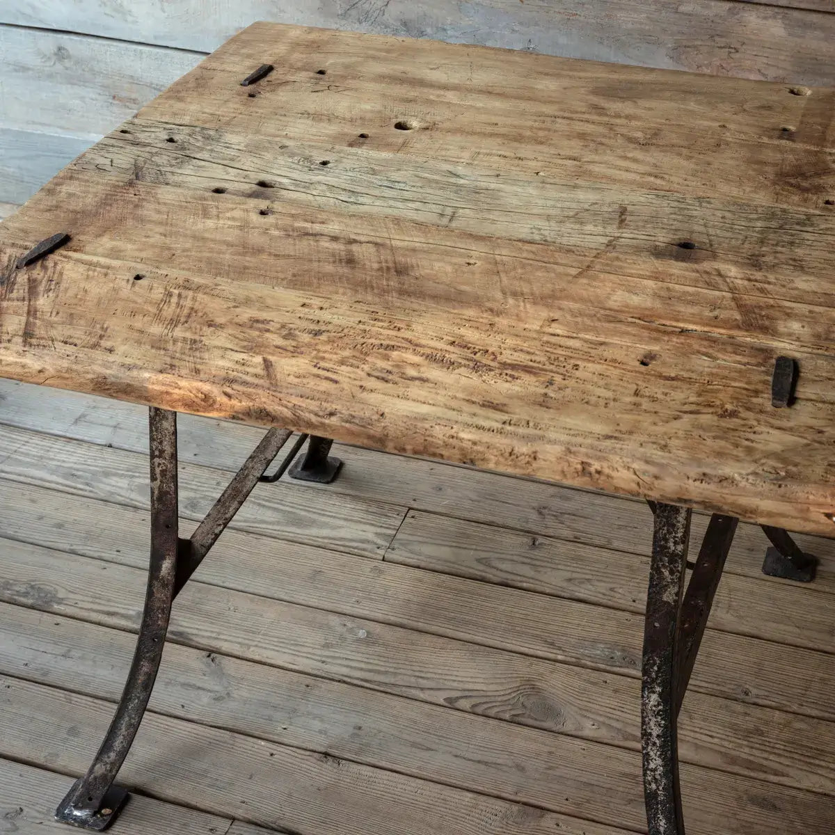 This rustic patisserie bistro table, featuring a wood top and metal base, is perfect for adding function with old world charm to any farmhouse style space.