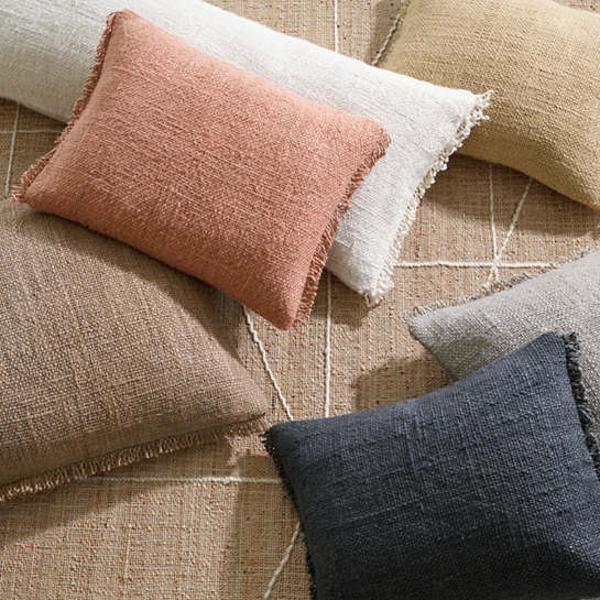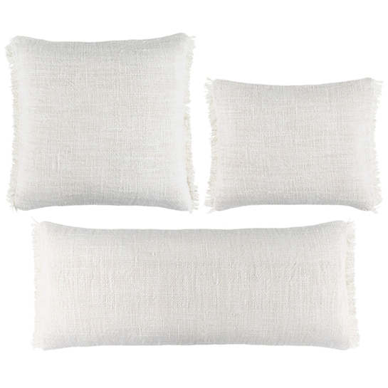 These beautifully nubby, rustic ivory linen pillows are woven on traditional looms, from premium flax. and laundered for authentic, soulful softness then hand-finished with a flirty fringe, perfect for adding a pop of color and texture to any bed or sofa.