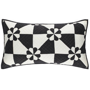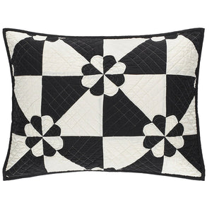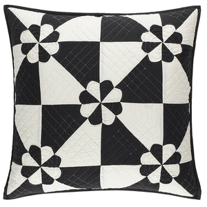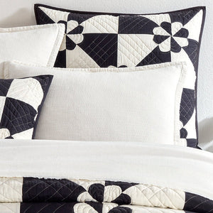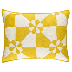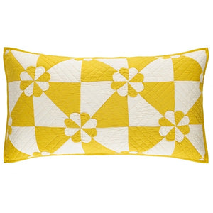Inspired by an antique textile foraged at Brimfield flea market, this sham gives traditional a graphic twist with a lightweight patchwork of silky yellow, blue or black and white cotton sateen fabric shapes held together with traditional quilting diamonds and sweet petal stitched rosettes, making this modern Americana Sham destined to become a family heirloom.