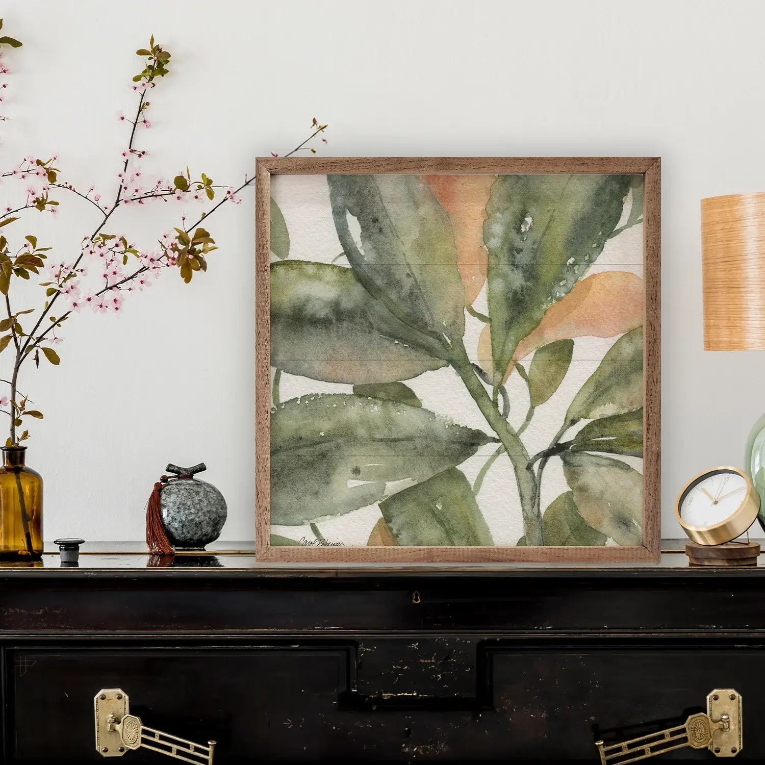This vintage style wood print, featuring a walnut wood frame with a beautiful watercolor plant painted in neutral and green hues on a shiplap background, is sure to provide beauty and farmhouse charm to any space.