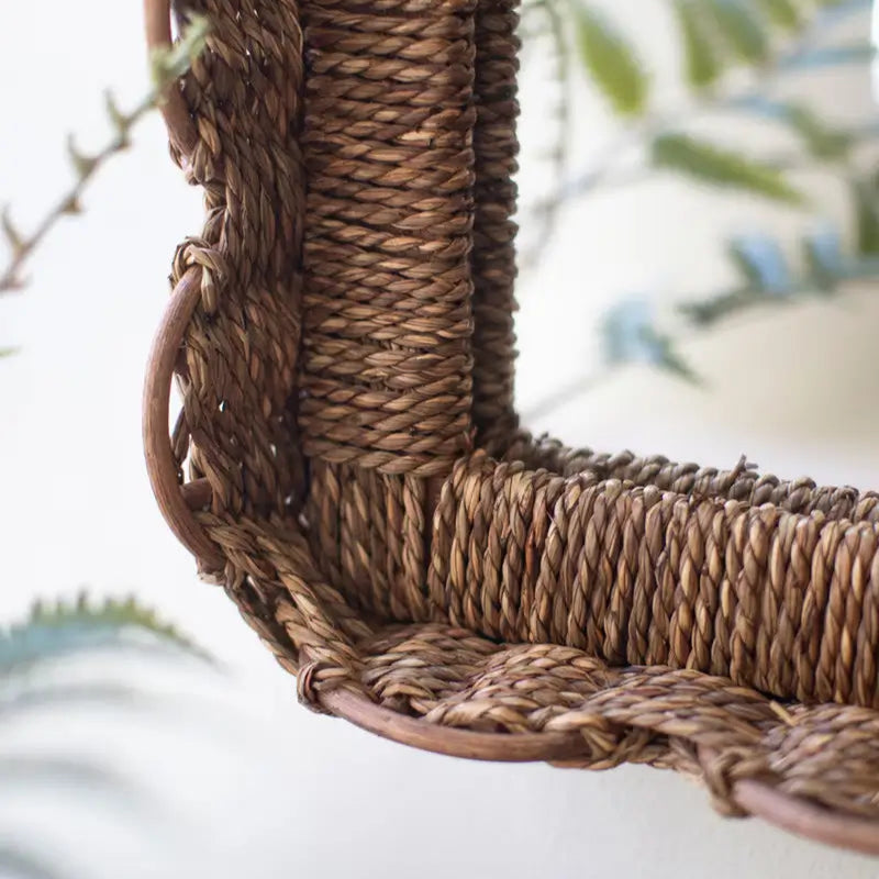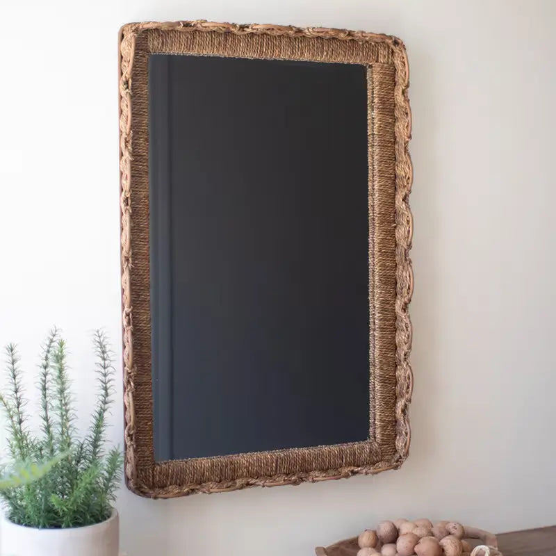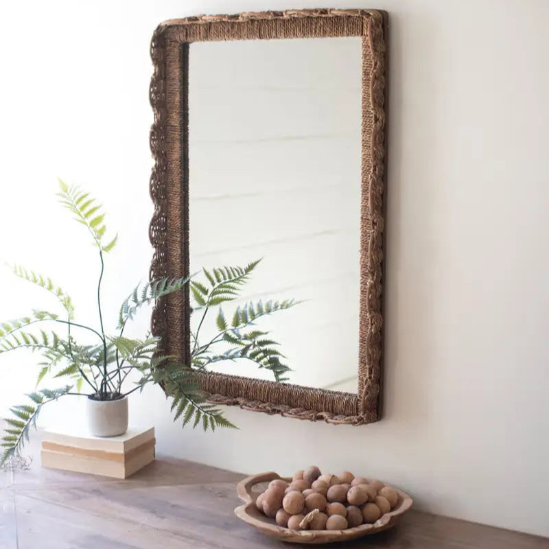 This beautiful woven wall mirror, featuring a rectangular shape with a natural finish and scalloped detail, is perfect for adding simplicity with texture to any space for a neutral farmhouse feel.